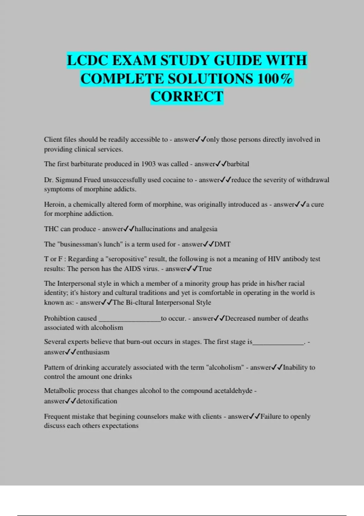 LCDC EXAM STUDY GUIDE WITH COMPLETE SOLUTIONS 100% CORRECT Client files should be readily accessible to - answeronly those persons directly involved in providing clinical services. The first barbiturate produced in 1903 was called - answerbarbital Dr. Sigmund Frued unsuccessfully used cocaine to - answerreduce the severity of withdrawal symptoms of morphine addicts. Heroin, a chemically altered form of morphine, was originally introduced as - answera cure for morphine addiction. THC can produce - answerhallucinations and analgesia The "businessman's lunch" is a term used for - answerDMT T or F : Regarding a "seropositive" result, the following is not a meaning of HIV antibody test results: The person has the AIDS virus. - answerTrue The Interpersonal style in which a member of a minority group has pride in his/her racial identity; it's history and cultural traditions and yet is comfortable in operating in the world is known as: - answerThe Bi-cltural Interpersonal Style Prohibtion caused _________________to occur. - answerDecreased number of deaths associated with alcoholism Several experts believe that burn-out occurs in stages. The first stage is______________. - answerenthusiasm Pattern of drinking accurately associated with the term "alcoholism" - answerInability to control the amount one drinks Metalbolic process that changes alcohol to the compound acetaldehyde - answerdetoxification Frequent mistake that begining counselors make with clients - answerFailure to openly discuss each others expectatio