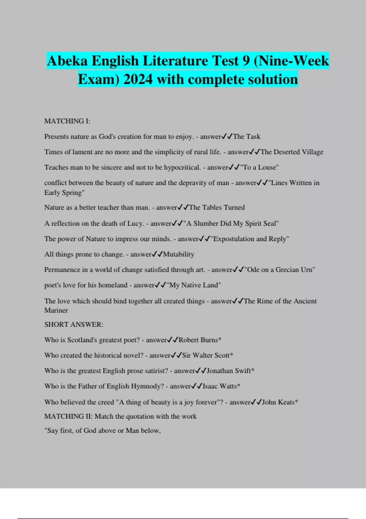 Abeka English Literature Test 9 (Nine-Week Exam) 2024 with complete solution MATCHING I: Presents nature as God's creation for man to enjoy. - answerThe Task Times of lament are no more and the simplicity of rural life. - answerThe Deserted Village Teaches man to be sincere and not to be hypocritical. - answer"To a Louse" conflict between the beauty of nature and the depravity of man - answer"Lines Written in Early Spring" Nature as a better teacher than man. - answerThe Tables Turned A reflection on the death of Lucy. - answer"A Slumber Did My Spirit Seal" The power of Nature to impress our minds. - answer"Expostulation and Reply" All things prone to change. - answerMutability Permanence in a world of change satisfied through art. - answer"Ode on a Grecian Urn" poet's love for his homeland - answer"My Native Land" The love which should bind together all created things - answerThe Rime of the Ancient Mariner SHORT ANSWER: Who is Scotland's greatest poet? - answerRobert Burns* Who created the historical novel? - answerSir Walter Scott* Who is the greatest English prose satirist? - answerJonathan Swift* Who is the Father of English Hymnody? - answerIsaac Watts* Who believed the creed "A thing of beauty is a joy forever"? - answerJohn Keats* MATCHING II: Match the quotation with the work "Say first, of God above or Man below