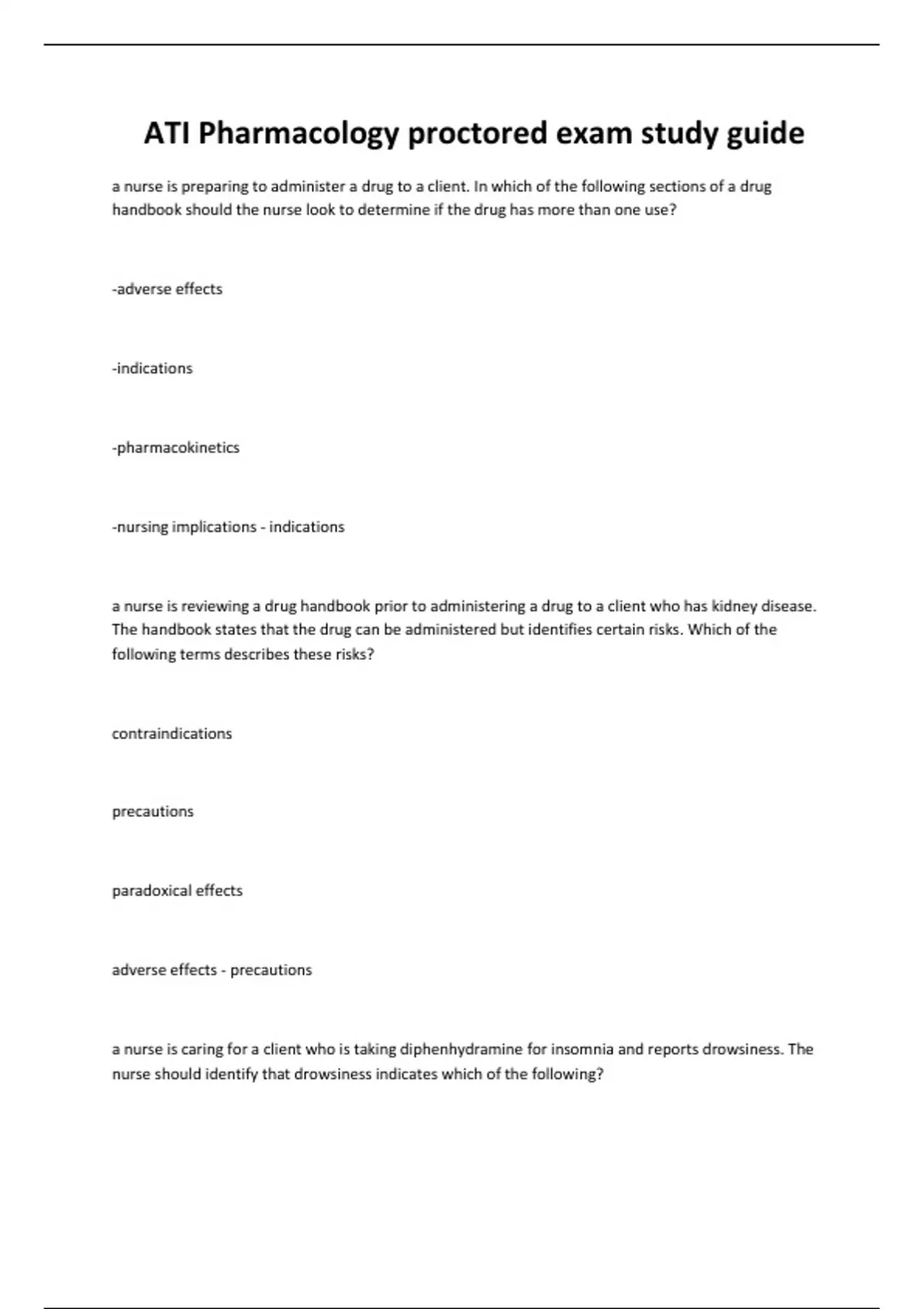 a nurse is preparing to administer a drug to a client. In which of the following sections of a drug handbook should the nurse look to determine if the drug has more than one use? -adverse effects -indications -pharmacokinetics -nursing implications - indications a nurse is reviewing a drug handbook prior to administering a drug to a client who has kidney disease. The handbook states that the drug can be administered but identifies certain risks. Which of the following terms describes these risks? contraindications precautions paradoxical effects adverse effects - precautions a nurse is caring for a client who is taking diphenhydramine for insomnia and reports drowsiness. The nurse should identify that drowsiness indicates which of the following? therapeutic effect adverse reaction contraindication precaution - therapeutic effect a nurse is providing teaching for a client who has a new prescription for a drug with a high potential for toxicity. Which of the following information should the nurse include? (Select all that apply) 1. periodic lab tests are essential to measure serum drug levels 2. monitoring for indications of toxicity is important 3. taking the drug with an inducing agent will increase the possibility of toxicity 4. taking the smallest effective dose is crucial 5. increasing fluid intake is recommended to avoid toxicity - 1,2,4 a nurse is providing teaching to a pregnant client who is taking captopril, an ACE inhibitor, to treat hypertension. The nurse informs the client that captopril is a teratogenic drug. The nurse should explain that teratogenic drugs can cause which of the following? maternal bleeding