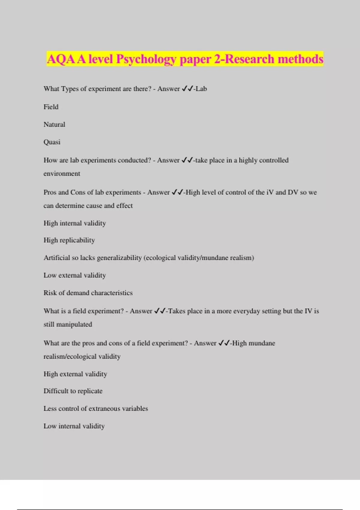 AQA A level Psychology paper 2-Research methods What Types of experiment are there? - Answer ️️ -Lab Field Natural Quasi How are lab experiments conducted? - Answer ️️ -take place in a highly controlled environment Pros and Cons of lab experiments - Answer ️️ -High level of control of the iV and DV so we can determine cause and effect High internal validity High replicability Artificial so lacks generalizability (ecological validity/mundane realism) Low external validity Risk of demand characteristics What is a field experiment? - Answer ️️ -Takes place in a more everyday setting but the IV is still manipulated What are the pros and cons of a field experiment? - Answer ️️ -High mundane realism/ecological validity High external validity Difficult to replicate Less control of extraneous variables Low internal validity Ethical issues eg consent and privacy What is a natural experiment? - Answer ️️ -The IV occurs naturally rather than being manipulated by the researcher. Can be conducted in a lab or field setting What are the pros and cons of natural experiment? - Answer ️️ -High mundane realism/ecological validity Opportunities may come along rarely Ppts may not be randomly allocated to experimental conditions What is a quasi experiment? - Answer ️️ -Has an IV based on existing difference between ppl eg age, gender with no manipulation from the experimenter What are the pros and cons of quasi experiment ? - Answer ️️ -Controlled conditions High internal validity and replicability Cannot randomly allocate ppts so there is a chance of confounding variables Difficult to establish cause and effect without the manipulation of the IV What types of observations are there? - Answer ️️ -Naturalistic, controlled, covert, overt, participant, non participant Describe Naturalistic observation - Answer ️️ -Behavior is studied in a natural environment where nothing is changed. What are the pros and cons of Naturalistic observation? - Answer ️️ -High external validity Hard to replic