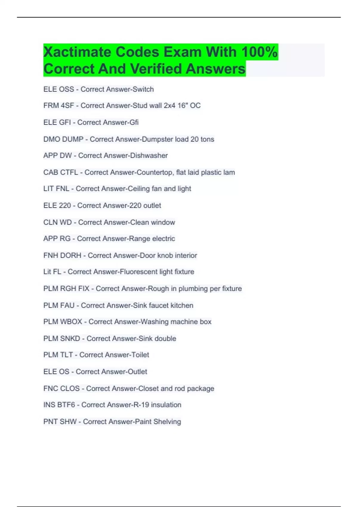 Xactimate Codes Exam With 100% Correct And Verified Answers ELE OSS - Correct Answer-Switch FRM 4SF - Correct Answer-Stud wall 2x4 16" OC ELE GFI - Correct Answer-Gfi DMO DUMP - Correct Answer-Dumpster load 20 tons APP DW - Correct Answer-Dishwasher CAB CTFL - Correct Answer-Countertop, flat laid plastic lam LIT FNL - Correct Answer-Ceiling fan and light ELE 220 - Correct Answer-220 outlet CLN WD - Correct Answer-Clean window APP RG - Correct Answer-Range electric FNH DORH - Correct Answer-Door knob interior Lit FL - Correct Answer-Fluorescent light fixture PLM RGH FIX - Correct Answer-Rough in plumbing per fixture PLM FAU - Correct Answer-Sink faucet kitchen PLM WBOX - Correct Answer-Washing machine box PLM SNKD - Correct Answer-Sink double PLM TLT - Correct Answer-Toilet ELE OS - Correct Answer-Outlet FNC CLOS - Correct Answer-Closet and rod package INS BTF6 - Correct Answer-R-19 insulation PNT SHW - Correct Answer-Paint Shelving FNC SH12 - Correct Answer-12" Shelving PNT JST - Correct Answer-Seal Joists CAB CUB - Correct Answer-Cabinet custom base unit Add - Correct Answer-Custom cabinet full height Add - Correct Answer-Granite Countertop DOR OH16 - Correct Answer-Overhead door 16x7 TMP POW - Correct Answer-Temporary power usage per month TMP TLT - Correct Answer-Temporary toilet per month RFG FLPIPE - Correct Answer-Flashing pipe jack FRM J10SF> - Correct Answer-Joist floor or ceiling 2x10 SFG FACW6- - Correct Answer-Fascia 1x6 #2 pine FRM 4x4 - Correct Answer-4x4 square wood post PNT FACW - Correct Answer-Prime and paint exterior fascia