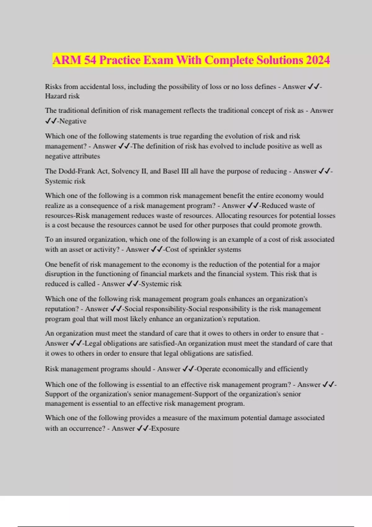 ARM 54 Practice Exam With Complete Solutions 2024 Risks from accidental loss, including the possibility of loss or no loss defines - Answer ️️ - Hazard risk The traditional definition of risk management reflects the traditional concept of risk as - Answer ️️ -Negative Which one of the following statements is true regarding the evolution of risk and risk management? - Answer ️️ -The definition of risk has evolved to include positive as well as negative attributes The Dodd-Frank Act, Solvency II, and Basel III all have the purpose of reducing - Answer ️️ - Systemic risk Which one of the following is a common risk management benefit the entire economy would realize as a consequence of a risk management program? - Answer ️️ -Reduced waste of resources-Risk management reduces waste of resources. Allocating resources for potential losses is a cost because the resources cannot be used for other purposes that could promote growth. To an insured organization, which one of the following is an example of a cost of risk associated with an asset or activity? - Answer ️️ -Cost of sprinkler systems One benefit of risk management to the economy is the reduction of the potential for a major disruption in the functioning of financial markets and the financial system. This risk that is reduced is called - Answer ️️ -Systemic risk Which one of the following risk management program goals enhances an organization's reputation? - Answer ️️ -Social responsibility-Social responsibility is the risk management program goal that will most likely enhance an organization's reputation. An organization must meet the standard of care that it owes to others in order to ensure that - Answer ️️ -Legal obligations are satisfied-An organization must meet the standard of care that it owes to others in order to ensure that legal obligations are satisfied. Risk management programs should - Answer ️️ -Operate economically and efficiently Which one of the following is essential to an effective risk management program? - Answer ️️ - Support of the organization's senior management-Support of the organization's senior management is essential to an effective risk management program. Which one of the following provides a measure of the maximum potential damage associated with an occurrence? - Answer ️️ -Exposure In an effort to grow its personal lines book, an insurer decides to offer discounts on homeowners and personal auto insurance to the employees of its largest business lines account. Which one of the following risk measures is most likely to increase as a result of this marketing decision? - Answer ️️ -Correlation-The insurer's risk correlation will most likely increase as a result of this marketing decision. According to the law of large numbers, as the number of exposure units insured increases, - Answer ️️ -The relative accuracy of predictions about future losses increases-According to the law of large numbers, as the number of exposure units insured increases, the relative accuracy of predictions about future losses increases. The relationship between which two basic measures is critical for risk management in assessing risk and deciding whether and how to manage it? - Answer ️️ -Likelihood and consequences Risk can be classified as diversifiable or nondiversifiable. Which one of the following statements is true with respect to this type of risk classification? - Answer ️️ -Diversifiable risks tend not to be correlated so they can be managed through diversification or spread of risk-Diversifiable risks tend not to be correlated so they can be managed through diversification or spread of risk. George works for a large company and part of his job is to monitor assets according to their liquidity. George is particularly concerned that the company fleet cars are affecting its liquidity and rising fuel prices are having an adverse effect during tight economic markets. If George's concerns were categorized as causes of loss according to the quadrants of risk, his concern most directly relates to which one of the following types of risks? - Answer ️️ -Financial risks Billy owns a beach front cottage which has become his primary residence. Billy's primary concern is that his home will be hit by a hurricane and badly damaged or even destroyed. For Billy, this hurricane risk is a - Answer ️️ -Subjective risk Carol has worked as a payroll clerk for a small organization for 20 years. Over the years she received only two small salary increases and began to embezzle funds from the company since she felt she was not adequately compensated for her job efforts. In terms of the quadrants of risk, Carol's theft risk can be classified as - Answer ️️ -Both a hazard risk and an operational risk- Carol's theft risk can be classified as both a hazard risk and an operational risk. Three main theoretical concepts explain how enterprise risk management (ERM) works. One theoretical concept considers not only the combination of individual risks but also their interactions. This theoretical concept is - Answer ️️ -The portfolio theory The concept of correlation, in the context of why enterprise risk management works, - Answer ️️ -Is the proposition that correlation increases risk while uncorrelated risks can reduce risk-The concept of correlation, in the context of why enterprise risk management works, is the proposition that correlation increases risk while uncorrelated
