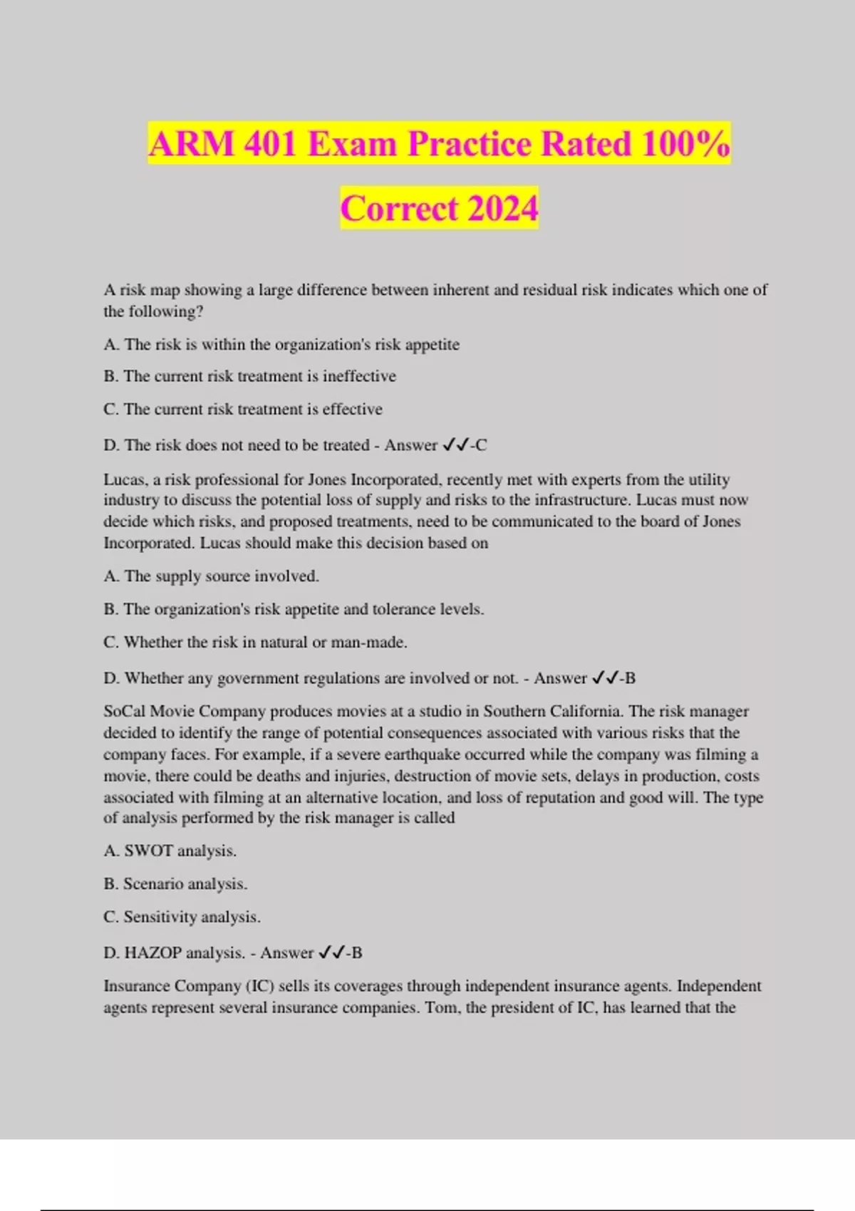 ARM 401 Exam Practice Rated 100% Correct 2024 A risk map showing a large difference between inherent and residual risk indicates which one of the following? A. The risk is within the organization's risk appetite B. The current risk treatment is ineffective C. The current risk treatment is effective D. The risk does not need to be treated - Answer ️️ -C Lucas, a risk professional for Jones Incorporated, recently met with experts from the utility industry to discuss the potential loss of supply and risks to the infrastructure. Lucas must now decide which risks, and proposed treatments, need to be communicated to the board of Jones Incorporated. Lucas should make this decision based on A. The supply source involved. B. The organization's risk appetite and tolerance levels. C. Whether the risk in natural or man-made. D. Whether any government regulations are involved or not. - Answer ️️ -B SoCal Movie Company produces movies at a studio in Southern California. The risk manager decided to identify the range of potential consequences associated with various risks that the company faces. For example, if a severe earthquake occurred while the company was filming a movie, there could be deaths and injuries, destruction of movie sets, delays in production, costs associated with filming at an alternative location, and loss of reputation and good will. The type of analysis performed by the risk manager is called A. SWOT analysis. B. Scenario analysis. C. Sensitivity analysis. D. HAZOP analysis. - Answer ️️ -B Insurance Company (IC) sells its coverages through independent insurance agents. Independent agents represent several insurance companies. Tom, the president of IC, has learned that the independent agent who is the highest producer for IC is considering selling his agency. IC is considering acquiring the agency since Tom is concerned that if the agency is sold, IC may lose a substantial amount of business. Tom asked IC's risk manager to analyze the prospective purchase. The analysis revealed that the acquisition would likely secure most of IC's book of business with the agency but also revealed local competitors that would try to place the business as well. In addition, the analysis revealed the opportunity for IC to move some accounts currently placed with other insurers over to IC. Also, it was learned that a competitor expressed an interest in the agency acquisition. The analysis performed by the risk manager is a - Answer ️️ -D Murray Trucking is interested in evaluating which risk factors are most likely to lead to the most costly accidents. They are evaluating risk factors such as speed, weather conditions, driver experience, distance traveled, and gross vehicle weight. Which one of the following statistical measurements would be useful for the risk manager when calculating the probability of the different risk factors causing severe accidents? A. Telematics B. Inverse covariance C. Variance D. Monte Carlo simulation - Answer ️️ -C Blithe Manufacturing has experienced a drop in market share. The marketing department has come up with a way to differentiate their product in order to regain market share. Blithe has assembled a team of individuals representing different organizational functions to analyze both internal and external factors of the new product and decide whether or not it is feasible. Which one of the following team approaches to risk identification is Blithe using? A. Delphi technique B. HAZOP workshop C. SWOT analysis D. Scenario analysis - Answer ️️ -C William is a project manager for Parker International. He has been assigned a key project with a short deadline. William realizes that this project is going to require revising the job duties of some individuals and a collaborative effort from of all team members. When revising job duties, William should do which one of the following? A. Overload some individuals with more work than others B. Try to enrich individuals' work rather than merely expand it C. Rely on the most senior individuals to take on additional duties D. Focus on the individuals' personality rather than results - Answer ️️ -B Shelton Manufacturing executives are growing increasingly concerned about wildfires and the potential effects on supply chain management. As the risk professional, Carla has been asked to meet with experts on the subject and report back to the executive team. Which one of the following should Carla do before meeting with external wildfire experts? A. Carla should speak with internal subject-matter experts in hopes that she can avoid needing the external wildfire experts. B. Carla should research the field and get a working understanding of wildfires. C. Carla should solicit questions from internal experts and submit them to the external wildfire experts. D. Carla should try to learn as much as possible about wildfires, so she can impress the wildfire experts. - Answer ️️ -B An organization practicing holistic risk management would assess the cost of raw materials and foreign exchange risk under which one of the following quadrants of risk? A. Strategic risk B. Financial risk C. Operational risk D. Hazard risk - Answer ️️ -B Risk maps differ from other risk assessment tools and techniques in which one of the following ways? A. Risk maps dissect processes within the organization from input to output for the purpose of improving them. B. Risk maps identify, prioritize, and quantify risks in a two-dimensional pictorial that illustrates frequency and severity on vertical and horizontal axes. C. Risk maps have the potential to identify both negative risks and opportunity risks. D. Risk maps are able to quickly explore a vast number of possible outcomes based on large datasets. - Answer ️️ -B As a best practice, a risk register should be an interactive computer system. Which one of the following individuals should be responsible for continually updating risk information? A. Customer B. Risk management pro