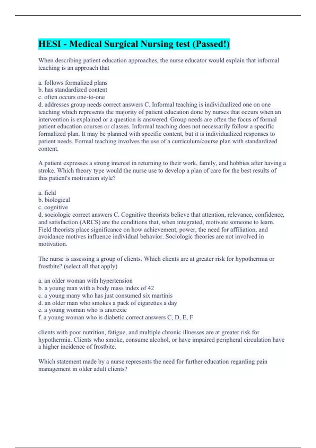 When describing patient education approaches, the nurse educator would explain that informal teaching is an approach that a. follows formalized plans b. has standardized content c. often occurs one-to-one d. addresses group needs correct answers C. Informal teaching is individualized one on one teaching which represents the majority of patient education done by nurses that occurs when an intervention is explained or a question is answered. Group needs are often the focus of formal patient education courses or classes. Informal teaching does not necessarily follow a specific formalized plan. It may be planned with specific content, but it is individualized responses to patient needs. Formal teaching involves the use of a curriculum/course plan with standardized content. A patient expresses a strong interest in returning to their work, family, and hobbies after having a stroke. Which theory type would the nurse use to develop a plan of care for the best results of this patient's motivation style? a. field b. biological c. cognitive d. sociologic correct answers C. Cognitive theorists believe that attention, relevance, confidence, and satisfaction (ARCS) are the conditions that, when integrated, motivate someone to learn. Field theorists place significance on how achievement, power, the need for affiliation, and avoidance motives influence individual behavior. Sociologic theories are not involved in motivation. The nurse is assessing a group of clients. Which clients are at greater risk for hypothermia or frostbite? (select all that apply) a. an older woman with hypertension b. a young man with a body mass index of 42 c. a young many who has just consumed six martinis d. an older man who smokes a pack of cigarettes a day e. a young woman who is anorexic f. a young woman who is diabetic correct answers C, D, E, F clients with poor nutrition, fatigue, and multiple chronic illnesses are at greater risk for hypothermia. Clients who smoke, consume alcohol, or have impaired peripheral circulation have a higher incidence of frostbite. Which statement made by a nurse represents the need for further education regarding pain management in older adult clients?
