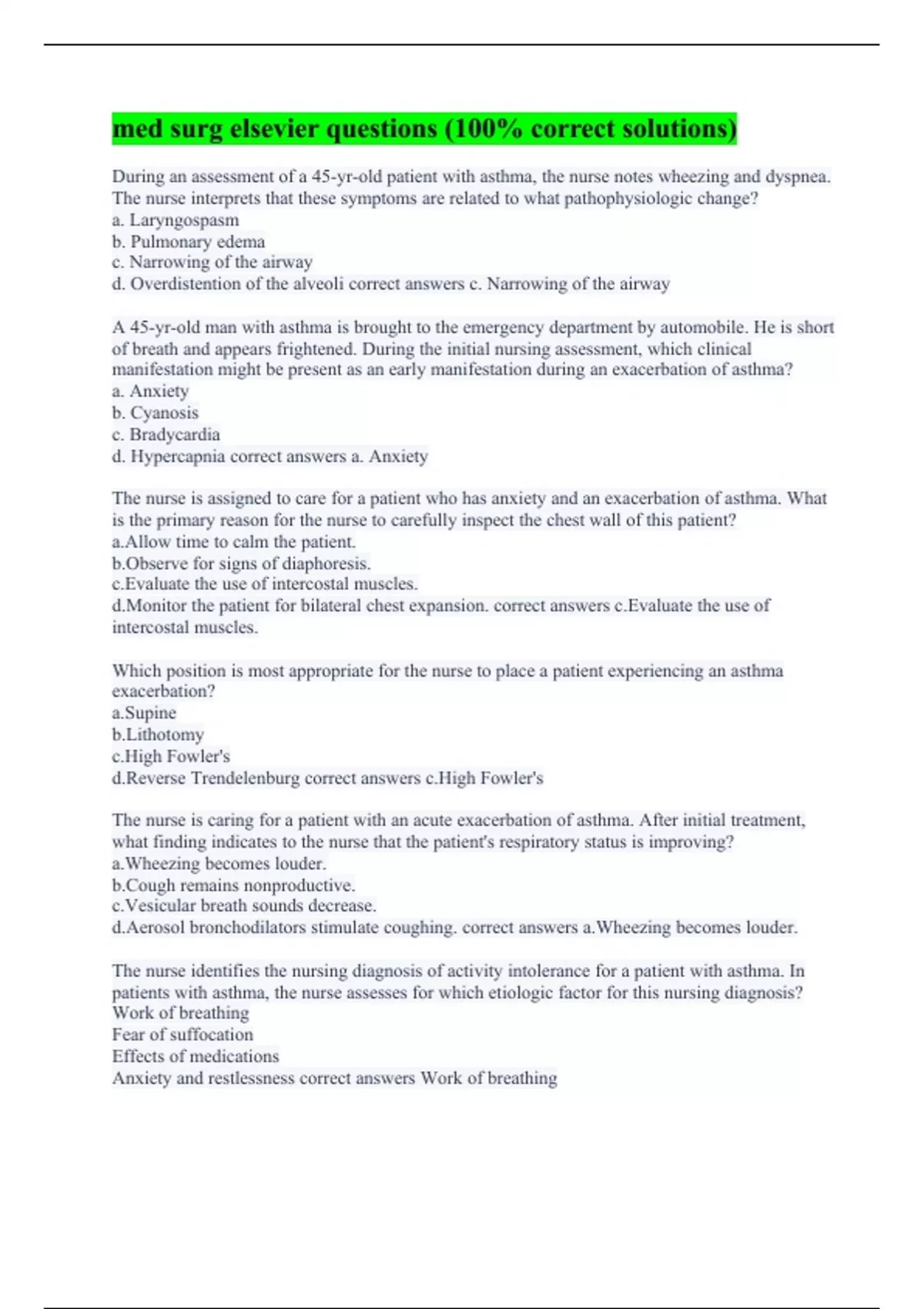 During an assessment of a 45-yr-old patient with asthma, the nurse notes wheezing and dyspnea. The nurse interprets that these symptoms are related to what pathophysiologic change? a. Laryngospasm b. Pulmonary edema c. Narrowing of the airway d. Overdistention of the alveoli correct answers c. Narrowing of the airway A 45-yr-old man with asthma is brought to the emergency department by automobile. He is short of breath and appears frightened. During the initial nursing assessment, which clinical manifestation might be present as an early manifestation during an exacerbation of asthma? a. Anxiety b. Cyanosis c. Bradycardia d. Hypercapnia correct answers a. Anxiety The nurse is assigned to care for a patient who has anxiety and an exacerbation of asthma. What is the primary reason for the nurse to carefully inspect the chest wall of this patient? a.Allow time to calm the patient. b.Observe for signs of diaphoresis. c.Evaluate the use of intercostal muscles. d.Monitor the patient for bilateral chest expansion. correct answers c.Evaluate the use of intercostal muscles. Which position is most appropriate for the nurse to place a patient experiencing an asthma exacerbation? a.Supine b.Lithotomy c.High Fowler's d.Reverse Trendelenburg correct answers c.High Fowler's The nurse is caring for a patient with an acute exacerbation of asthma. After initial treatment, what finding indicates to the nurse that the patient's respiratory status is improving? a.Wheezing becomes louder. b.Cough remains nonproductive. c.Vesicular breath sounds decrease. d.Aerosol bronchodilators stimulate coughing. correct answers a.Wheezing becomes louder. The nurse identifies the nursing diagnosis of activity intolerance for a patient with asthma. In patients with asthma, the nurse assesses for which etiologic factor for this nursing diagnosis? Work of breathing Fear of suffocation Effects of medications Anxiety and restlessness correct answers Work of breathing