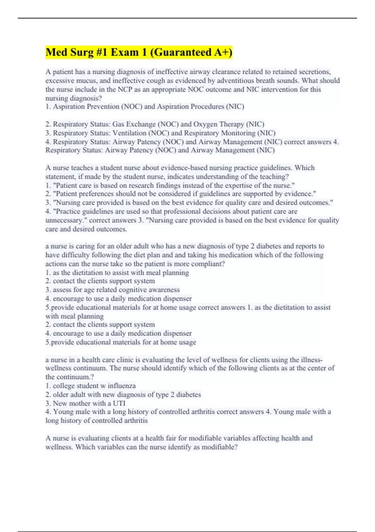 A patient has a nursing diagnosis of ineffective airway clearance related to retained secretions, excessive mucus, and ineffective cough as evidenced by adventitious breath sounds. What should the nurse include in the NCP as an appropriate NOC outcome and NIC intervention for this nursing diagnosis? 1. Aspiration Prevention (NOC) and Aspiration Procedures (NIC) 2. Respiratory Status: Gas Exchange (NOC) and Oxygen Therapy (NIC) 3. Respiratory Status: Ventilation (NOC) and Respiratory Monitoring (NIC) 4. Respiratory Status: Airway Patency (NOC) and Airway Management (NIC) correct answers 4. Respiratory Status: Airway Patency (NOC) and Airway Management (NIC) A nurse teaches a student nurse about evidence-based nursing practice guidelines. Which statement, if made by the student nurse, indicates understanding of the teaching? 1. "Patient care is based on research findings instead of the expertise of the nurse." 2. "Patient preferences should not be considered if guidelines are supported by evidence." 3. "Nursing care provided is based on the best evidence for quality care and desired outcomes." 4. "Practice guidelines are used so that professional decisions about patient care are unnecessary." correct answers 3. "Nursing care provided is based on the best evidence for quality care and desired outcomes. a nurse is caring for an older adult who has a new diagnosis of type 2 diabetes and reports to have difficulty following the diet plan and and taking his medication which of the following actions can the nurse take so the patient is more compliant? 1. as the dietitation to assist with meal planning 2. contact the clients support system 3. assess for age related cognitive awareness 4. encourage to use a daily medication dispenser de educational materials for at home usage correct answers 1. as the dietitation to assist with meal planning 2. contact the clients support system 4. encourage to use a daily medication dispenser de educational materials for at home usage a nurse in a health care clinic is evaluating the level of wellness for clients using the illness-wellness continuum. The nurse should identify which of the following clients as at the center of the continuum.? 1. college student w influenza 2. older adult with new diagnosis of type 2 diabetes 3. New mother with a UTI 4. Young male with a long history of controlled arthritis correct answers 4. Young male with a long history of controlled arthritis A nurse is evaluating clients at a health fair for modifiable variables affecting health and wellness. Which variables can the nurse identify as modifiable?
