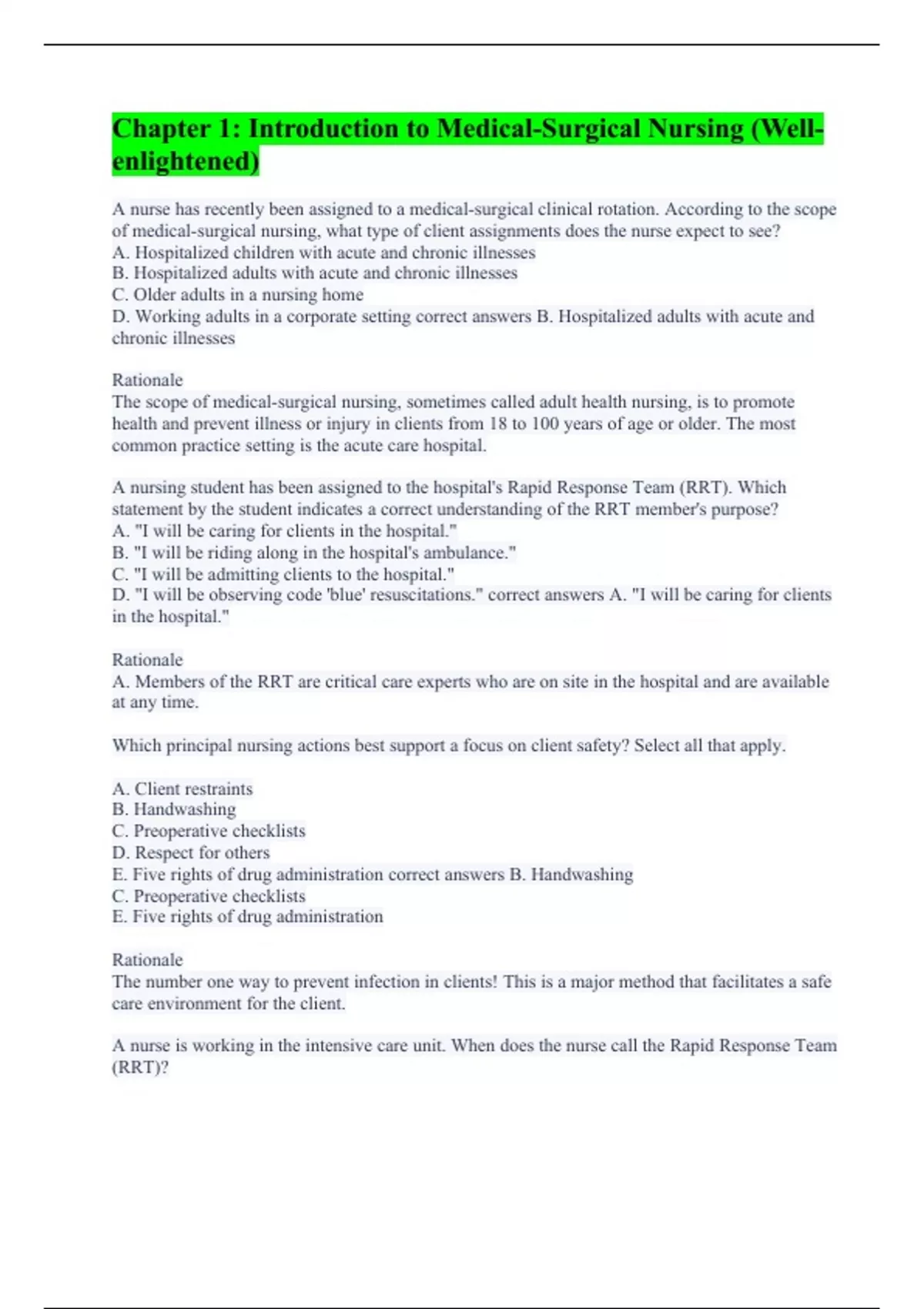 A nurse has recently been assigned to a medical-surgical clinical rotation. According to the scope of medical-surgical nursing, what type of client assignments does the nurse expect to see? A. Hospitalized children with acute and chronic illnesses B. Hospitalized adults with acute and chronic illnesses C. Older adults in a nursing home D. Working adults in a corporate setting correct answers B. Hospitalized adults with acute and chronic illnesses Rationale The scope of medical-surgical nursing, sometimes called adult health nursing, is to promote health and prevent illness or injury in clients from 18 to 100 years of age or older. The most common practice setting is the acute care hospital. A nursing student has been assigned to the hospital's Rapid Response Team (RRT). Which statement by the student indicates a correct understanding of the RRT member's purpose? A. "I will be caring for clients in the hospital." B. "I will be riding along in the hospital's ambulance." C. "I will be admitting clients to the hospital." D. "I will be observing code 'blue' resuscitations." correct answers A. "I will be caring for clients in the hospital." Rationale A. Members of the RRT are critical care experts who are on site in the hospital and are available at any time. Which principal nursing actions best support a focus on client safety? Select all that apply. A. Client restraints B. Handwashing C. Preoperative checklists D. Respect for others E. Five rights of drug administration correct answers B. Handwashing C. Preoperative checklists E. Five rights of drug administration Rationale The number one way to prevent infection in clients! This is a major method that facilitates a safe care environment for the client. A nurse is working in the intensive care unit. When does the nurse call the Rapid Response Team (RRT)?