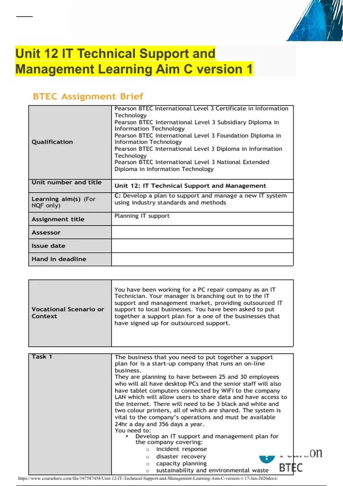 Unit 12 IT Technical Support and Management Learning Aim C version 1 BTEC Assignment Brief Qualification Pearson BTEC International Level 3 Certificate in Information Technology Pearson BTEC International Level 3 Subsidiary Diploma in Information Technology Pearson BTEC International Level 3 Foundation Diploma in Information Technology Pearson BTEC International Level 3 Diploma in Information Technology Pearson BTEC International Level 3 National Extended Diploma in Information Technology Unit number and title Unit 12: IT Technical Support and Management Learning aim(s) (For NQF only) C: Develop a plan to support and manage a new IT system using industry standards and methods Assignment title Planning IT support Assessor Issue date Hand in deadline Vocational Scenario or Context You have been working for a PC repair company as an IT Technician. Your manager is branching out in to the IT support and management market, providing outsourced IT support to local businesses. You have been asked to put together a support plan for a one of the businesses that have signed up for outsourced support.