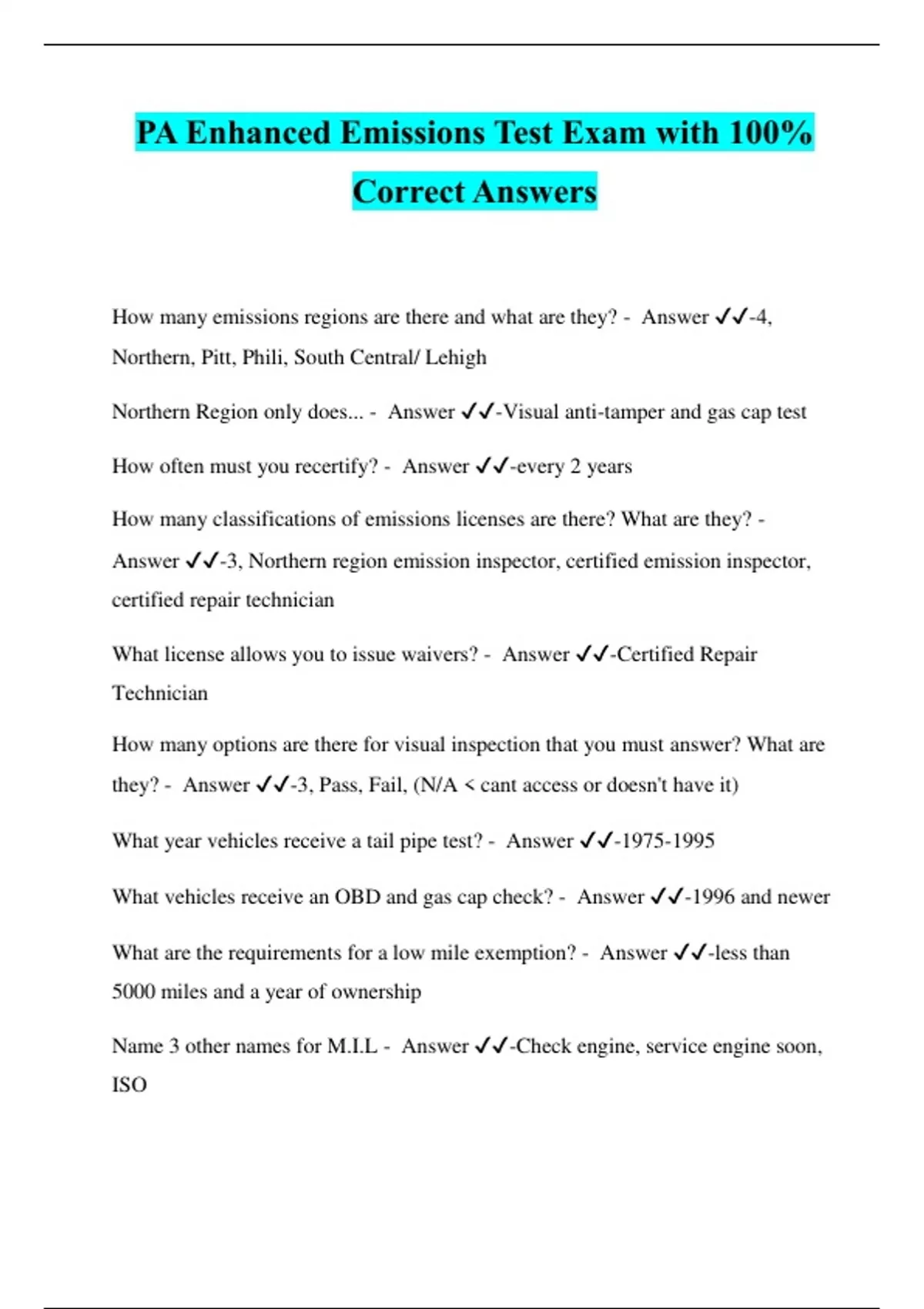 PA Enhanced Emissions Test Exam with 100% Correct Answers