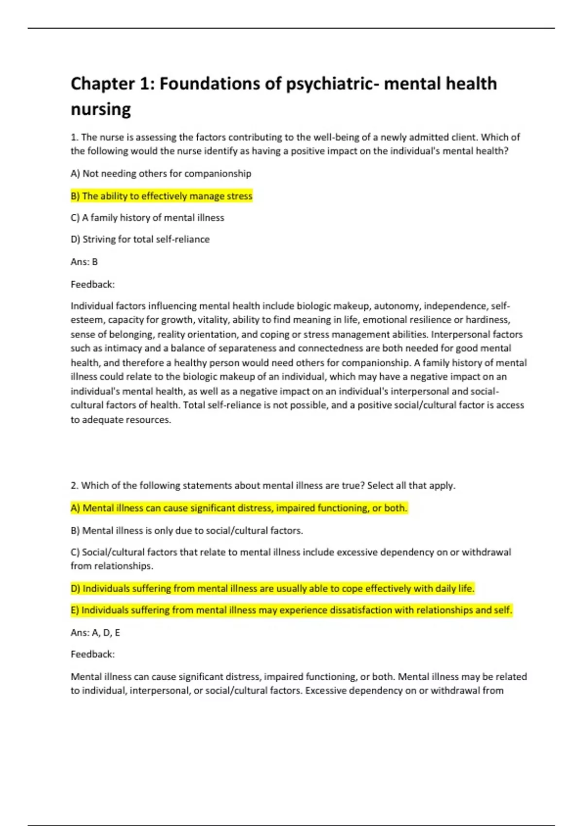 1. The nurse is assessing the factors contributing to the well-being of a newly admitted client. Which of the following would the nurse identify as having a positive impact on the individual's mental health? A) Not needing others for companionship B) The ability to effectively manage stress C) A family history of mental illness D) Striving for total self-reliance Ans: B Feedback: Individual factors influencing mental health include biologic makeup, autonomy, independence, selfesteem, capacity for growth, vitality, ability to find meaning in life, emotional resilience or hardiness, sense of belonging, reality orientation, and coping or stress management abilities. Interpersonal factors such as intimacy and a balance of separateness and connectedness are both needed for good mental health, and therefore a healthy person would need others for companionship. A family history of mental illness could relate to the biologic makeup of an individual, which may have a negative impact on an individual's mental health, as well as a negative impact on an individual's interpersonal and socialcultural factors of health. Total self-reliance is not possible, and a positive social/cultural factor is access to adequate resources. 2. Which of the following statements about mental illness are true? Select all that apply. A) Mental illness can cause significant distress, impaired functioning, or both. B) Mental illness is only due to social/cultural factors. C) Social/cultural factors that relate to mental illness include excessive dependency on or withdrawal from relationships. D) Individuals suffering from mental illness are usually able to cope effectively with daily life. E) Individuals suffering from mental illness may experience dissatisfaction with relationships and self. Ans: A, D, E