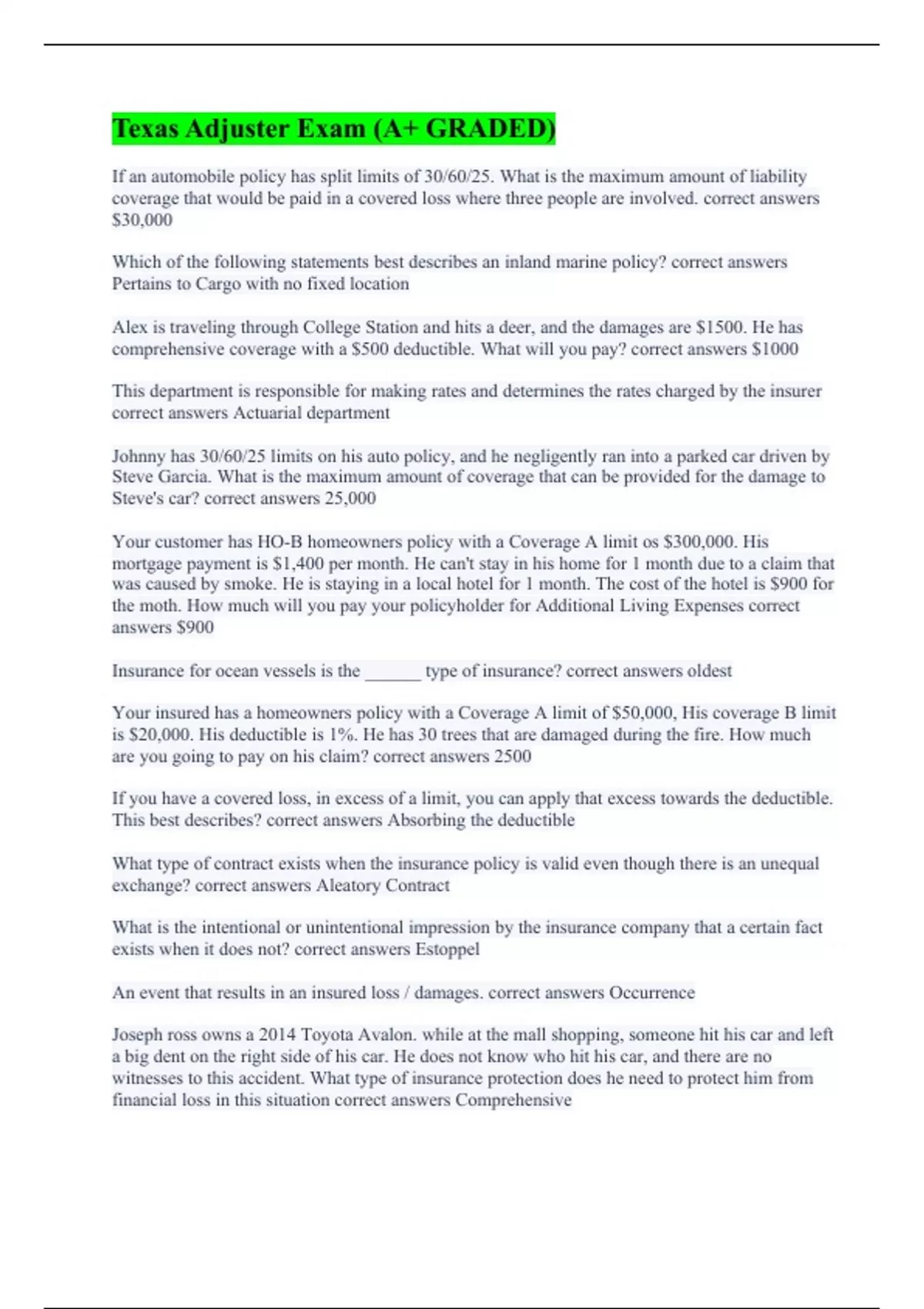 Texas Adjuster Exam (A+ GRADED)