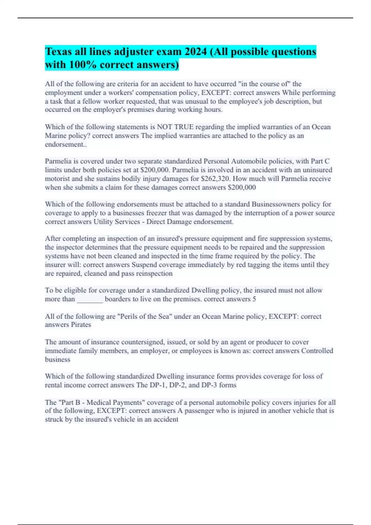Texas all lines adjuster exam 2024 (All possible questions with 100% correct answers)