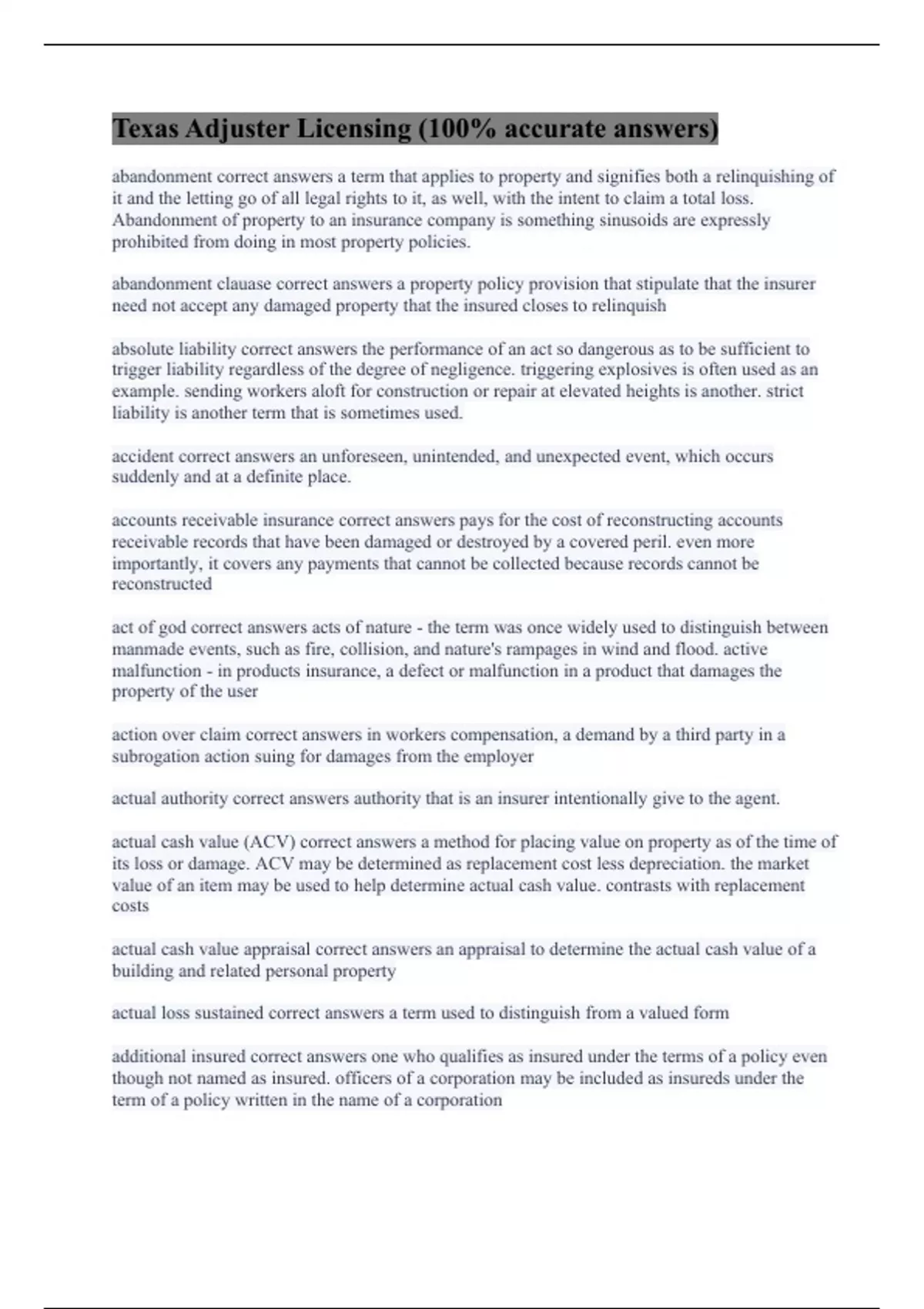 abandonment correct answers a term that applies to property and signifies both a relinquishing of it and the letting go of all legal rights to it, as well, with the intent to claim a total loss. Abandonment of property to an insurance company is something sinusoids are expressly prohibited from doing in most property policies. abandonment clauase correct answers a property policy provision that stipulate that the insurer need not accept any damaged property that the insured closes to relinquish absolute liability correct answers the performance of an act so dangerous as to be sufficient to trigger liability regardless of the degree of negligence. triggering explosives is often used as an example. sending workers aloft for construction or repair at elevated heights is another. strict liability is another term that is sometimes used. accident correct answers an unforeseen, unintended, and unexpected event, which occurs suddenly and at a definite place. accounts receivable insurance correct answers pays for the cost of reconstructing accounts receivable records that have been damaged or destroyed by a covered peril. even more importantly, it covers any payments that cannot be collected because records cannot be reconstructed act of god correct answers acts of nature - the term was once widely used to distinguish between manmade events, such as fire, collision, and nature's rampages in wind and flood. active malfunction - in products insurance, a defect or malfunction in a product that damages the property of the user action over claim correct answers in workers compensation, a demand by a third party in a subrogation action suing for damages from the employer actual authority correct answers authority that is an insurer intentionally give to the agent. actual cash value (ACV) correct answers a method for placing value on property as of the time of its loss or damage. ACV may be determined as replacement cost less depreciation. the market value of an item may be used to help determine actual cash value. contrasts with replacement costs actual cash value appraisal correct answers an appraisal to determine the actual cash value of a building and related personal property actual loss sustained correct answers a term used to distinguish from a valued form additional insured correct answers one who qualifies as insured under the terms of a policy even though not named as insured. officers of a corporation may be included as insureds under the term of a policy written in the name of a corporation