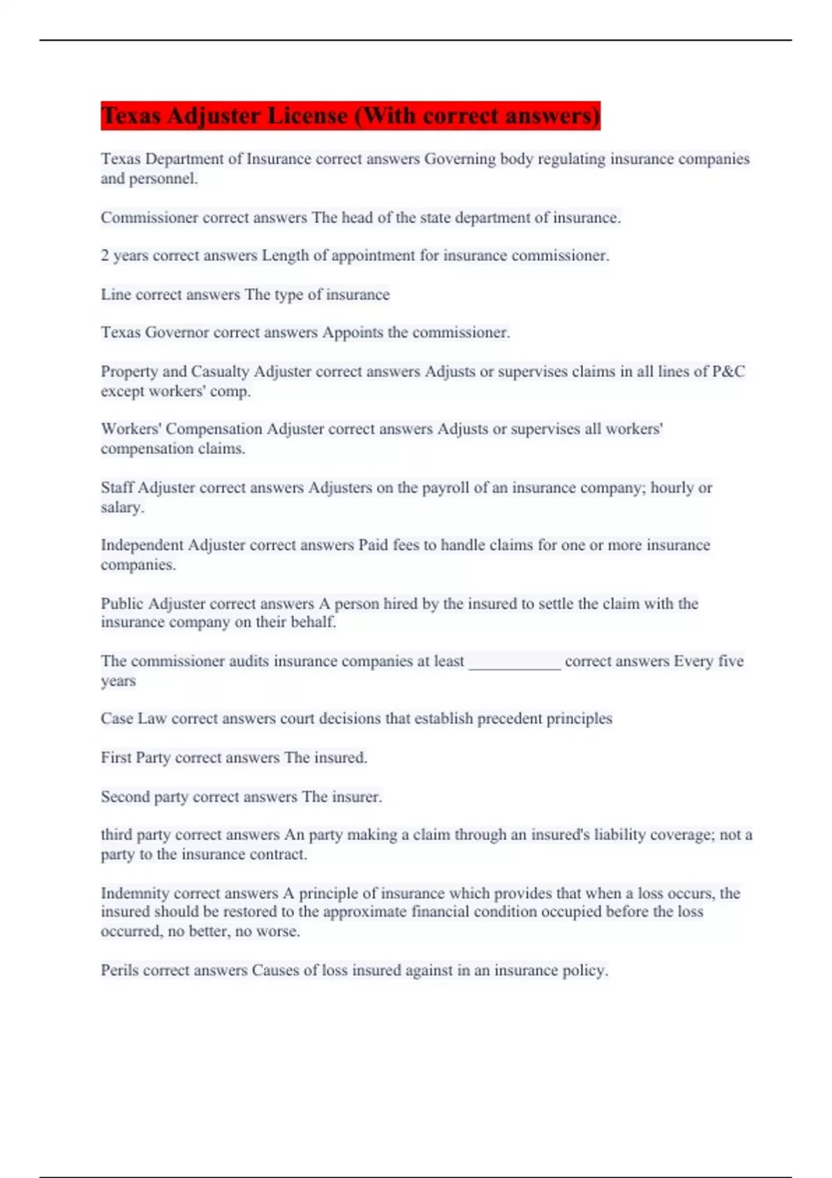 Texas Department of Insurance correct answers Governing body regulating insurance companies and personnel. Commissioner correct answers The head of the state department of insurance. 2 years correct answers Length of appointment for insurance commissioner. Line correct answers The type of insurance Texas Governor correct answers Appoints the commissioner. Property and Casualty Adjuster correct answers Adjusts or supervises claims in all lines of P&C except workers' comp. Workers' Compensation Adjuster correct answers Adjusts or supervises all workers' compensation claims. Staff Adjuster correct answers Adjusters on the payroll of an insurance company; hourly or salary. Independent Adjuster correct answers Paid fees to handle claims for one or more insurance companies. Public Adjuster correct answers A person hired by the insured to settle the claim with the insurance company on their behalf. The commissioner audits insurance companies at least ___________ correct answers Every five years Case Law correct answers court decisions that establish precedent principles First Party correct answers The insured. Second party correct answers The insurer. third party correct answers An party making a claim through an insured's liability coverage; not a party to the insurance contract. Indemnity correct answers A principle of insurance which provides that when a loss occurs, the insured should be restored to the approximate financial condition occupied before the loss occurred, no better, no worse. Perils correct answers Causes of loss insured against in an insurance policy.