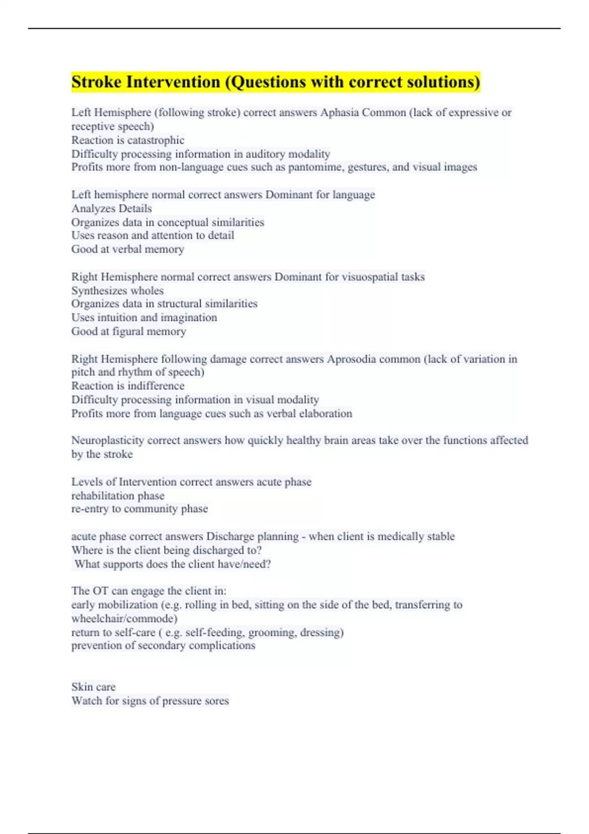 Left Hemisphere (following stroke) correct answers Aphasia Common (lack of expressive or receptive speech) Reaction is catastrophic Difficulty processing information in auditory modality Profits more from non-language cues such as pantomime, gestures, and visual images Left hemisphere normal correct answers Dominant for language Analyzes Details Organizes data in conceptual similarities Uses reason and attention to detail Good at verbal memory Right Hemisphere normal correct answers Dominant for visuospatial tasks Synthesizes wholes Organizes data in structural similarities Uses intuition and imagination Good at figural memory Right Hemisphere following damage correct answers Aprosodia common (lack of variation in pitch and rhythm of speech) Reaction is indifference Difficulty processing information in visual modality Profits more from language cues such as verbal elaboration Neuroplasticity correct answers how quickly healthy brain areas take over the functions affected by the stroke Levels of Intervention correct answers acute phase rehabilitation phase re-entry to community phase acute phase correct answers Discharge planning - when client is medically stable Where is the client being discharged to? What supports does the client have/need? The OT can engage the client in: early mobilization (e.g. rolling in bed, sitting on the side of the bed, transferring to wheelchair/commode) return to self-care ( e.g. self-feeding, grooming, dressing) prevention of secondary complications Skin care Watch for signs of pressure sores