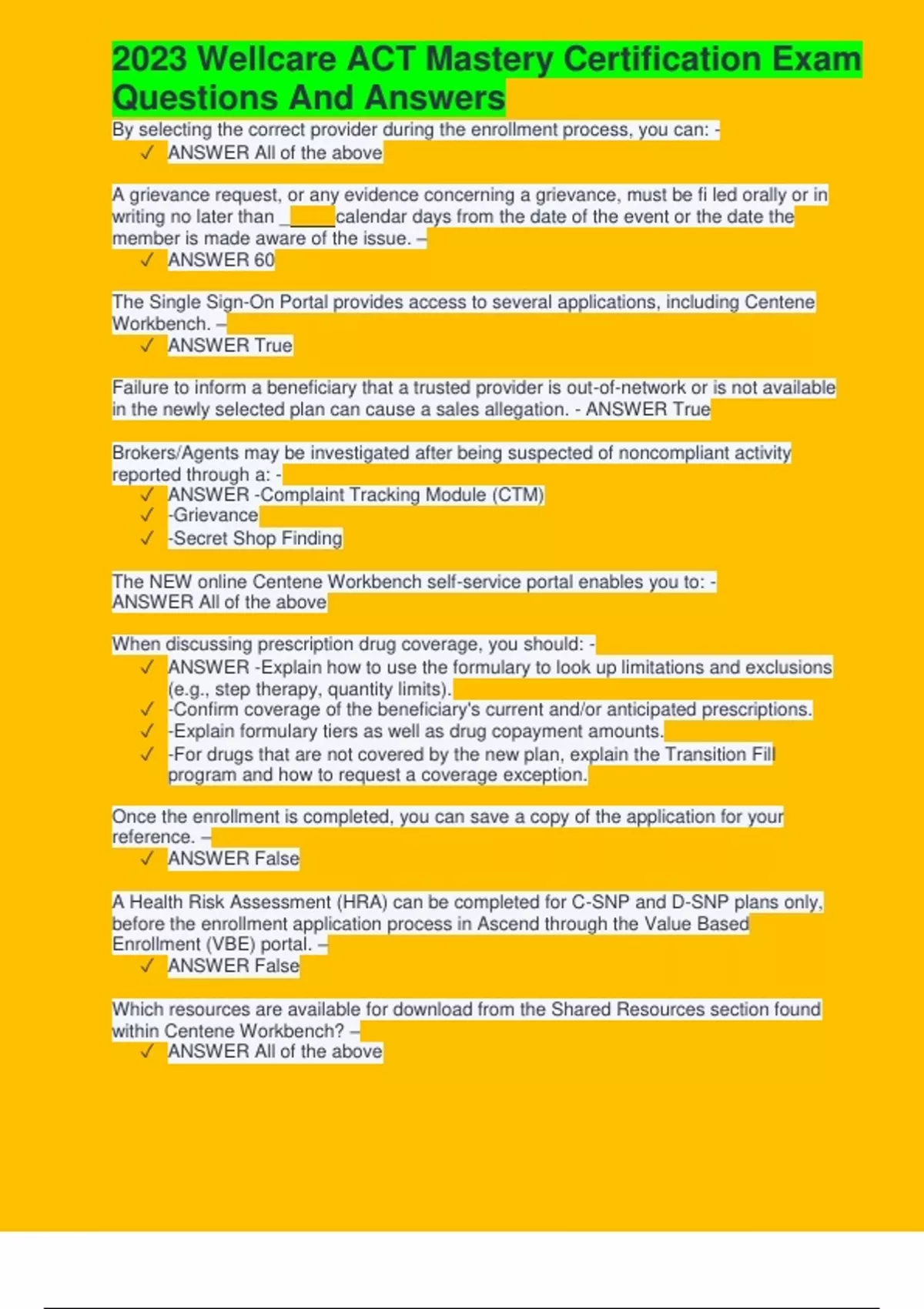 2023 Wellcare ACT Mastery Certification Exam Questions And Answers