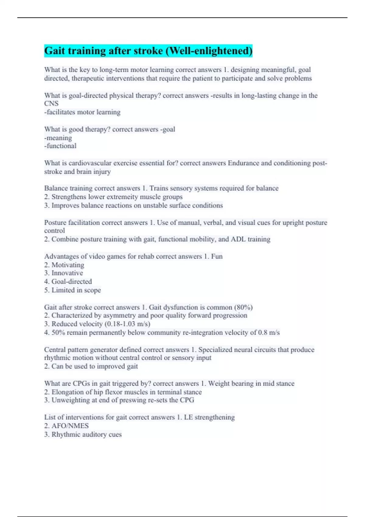 What is the key to long-term motor learning correct answers 1. designing meaningful, goal directed, therapeutic interventions that require the patient to participate and solve problems What is goal-directed physical therapy? correct answers -results in long-lasting change in the CNS -facilitates motor learning What is good therapy? correct answers -goal -meaning -functional What is cardiovascular exercise essential for? correct answers Endurance and conditioning post-stroke and brain injury Balance training correct answers 1. Trains sensory systems required for balance 2. Strengthens lower extremeity muscle groups 3. Improves balance reactions on unstable surface conditions Posture facilitation correct answers 1. Use of manual, verbal, and visual cues for upright posture control 2. Combine posture training with gait, functional mobility, and ADL training Advantages of video games for rehab correct answers 1. Fun 2. Motivating 3. Innovative 4. Goal-directed 5. Limited in scope Gait after stroke correct answers 1. Gait dysfunction is common (80%) 2. Characterized by asymmetry and poor quality forward progression 3. Reduced velocity (0.18-1.03 m/s) 4. 50% remain permanently below community re-integration velocity of 0.8 m/s Central pattern generator defined correct answers 1. Specialized neural circuits that produce rhythmic motion without central control or sensory input 2. Can be used to improved gait What are CPGs in gait triggered by? correct answers 1. Weight bearing in mid stance 2. Elongation of hip flexor muscles in terminal stance 3. Unweighting at end of preswing re-sets the CPG List of interventions for gait correct answers 1. LE strengthening 2. AFO/NMES 3. Rhythmic auditory cues