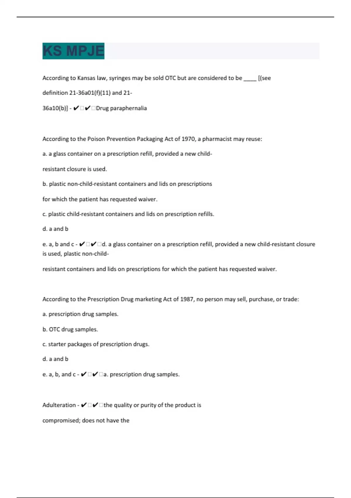 According to Kansas law, syringes may be sold OTC but are considered to be ____ [(see definition 21-36a01(f)(11) and 21- 36a10(b)] - ️️Drug paraphernalia According to the Poison Prevention Packaging Act of 1970, a pharmacist may reuse: a. a glass container on a prescription refill, provided a new child- resistant closure is used. b. plastic non-child-resistant containers and lids on prescriptions for which the patient has requested waiver. c. plastic child-resistant containers and lids on prescription refills. d. a and b e. a, b and c - ️️d. a glass container on a prescription refill, provided a new child-resistant closure is used, plastic non-child- resistant containers and lids on prescriptions for which the patient has requested waiver. According to the Prescription Drug marketing Act of 1987, no person may sell, purchase, or trade: a. prescription drug samples. b. OTC drug samples. c. starter packages of prescription drugs. d. a and b e. a, b, and c - ️️a. prescription drug samples.