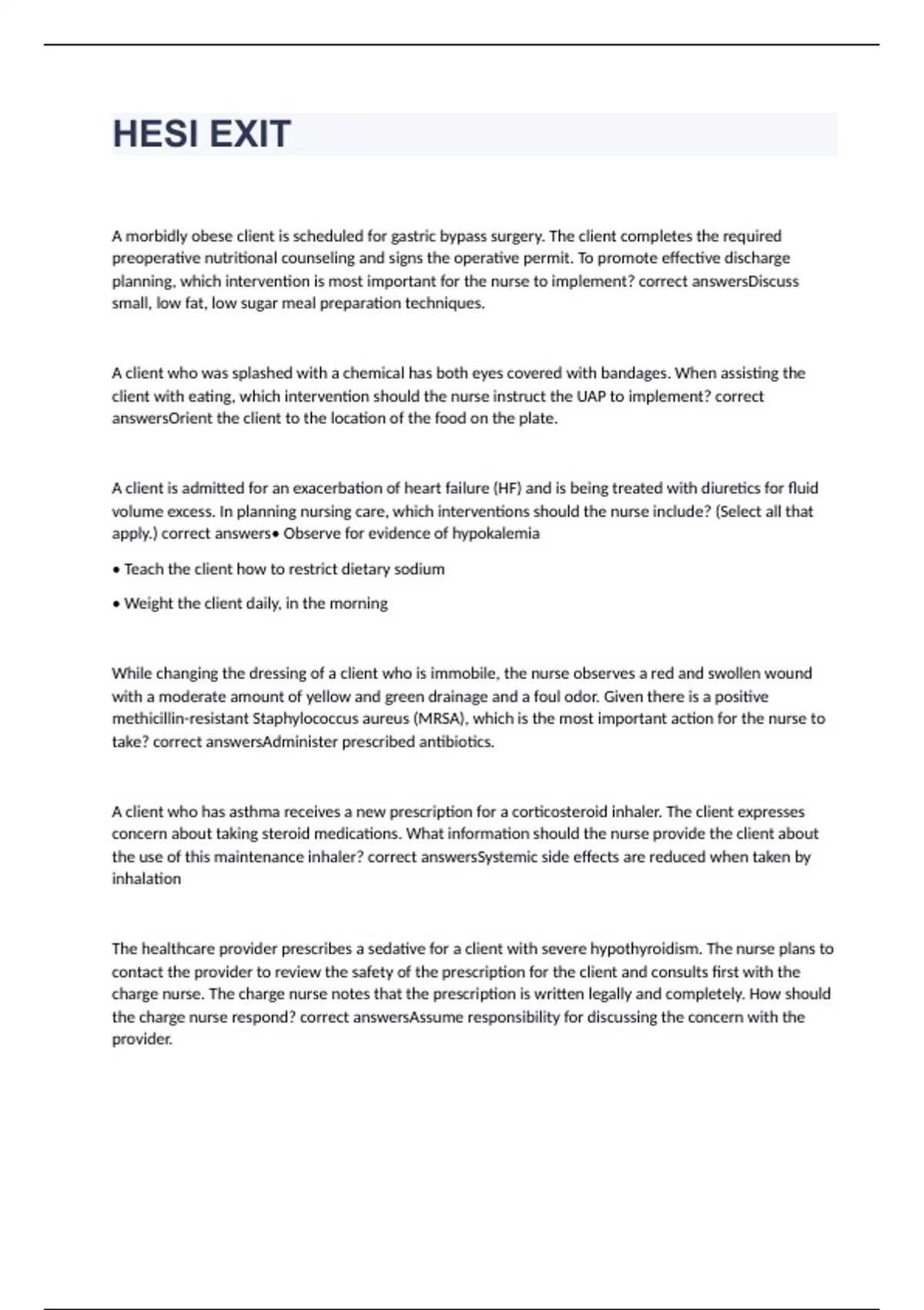 A morbidly obese client is scheduled for gastric bypass surgery. The client completes the required preoperative nutritional counseling and signs the operative permit. To promote effective discharge planning, which intervention is most important for the nurse to implement? correct answersDiscuss small, low fat, low sugar meal preparation techniques. A client who was splashed with a chemical has both eyes covered with bandages. When assisting the client with eating, which intervention should the nurse instruct the UAP to implement? correct answersOrient the client to the location of the food on the plate. A client is admitted for an exacerbation of heart failure (HF) and is being treated with diuretics for fluid volume excess. In planning nursing care, which interventions should the nurse include? (Select all that apply.) correct answers• Observe for evidence of hypokalemia • Teach the client how to restrict dietary sodium • Weight the client daily, in the morning While changing the dressing of a client who is immobile, the nurse observes a red and swollen wound with a moderate amount of yellow and green drainage and a foul odor. Given there is a positive methicillin-resistant Staphylococcus aureus (MRSA), which is the most important action for the nurse to take? correct answersAdminister prescribed antibiotics. A client who has asthma receives a new prescription for a corticosteroid inhaler. The client expresses concern about taking steroid medications. What information should the nurse provide the client about the use of this maintenance inhaler? correct answersSystemic side effects are reduced when taken by inhalation The healthcare provider prescribes a sedative for a client with severe hypothyroidism. The nurse plans to contact the provider to review the safety of the prescription for the client and consults first with the charge nurse. The charge nurse notes that the prescription is written legally and completely. How should the charge nurse respond? correct answersAssume responsibility for discussing the concern with the provider.