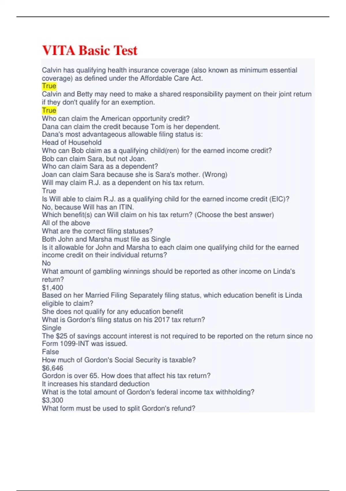 VITA BASIC TEST Questions and Answers (Rated A)