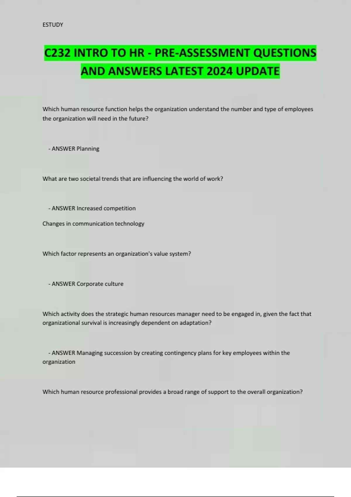 C232 INTRO TO HR - PRE-ASSESSMENT QUESTIONS AND ANSWERS LATEST 2024 UPDATE