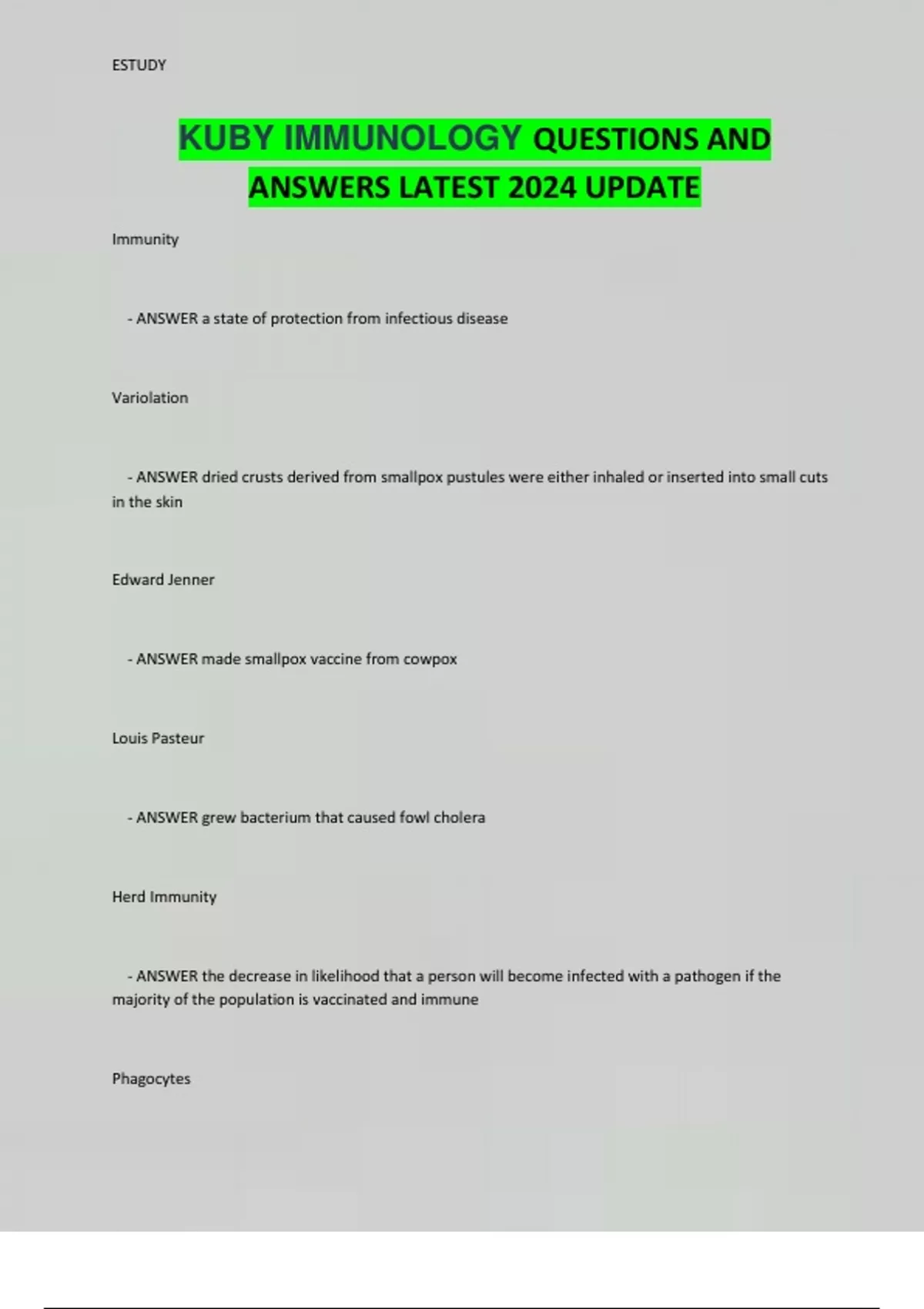 KUBY IMMUNOLOGY QUESTIONS AND ANSWERS LATEST 2024 UPDATE