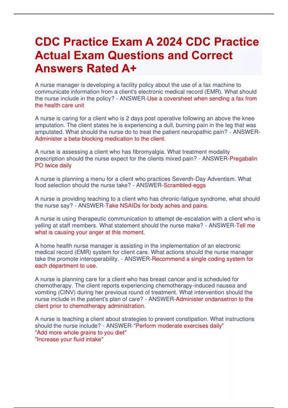 CDC Practice Exam A 2024 CDC Practice Actual Exam Questions and Correct Answers Rated A+