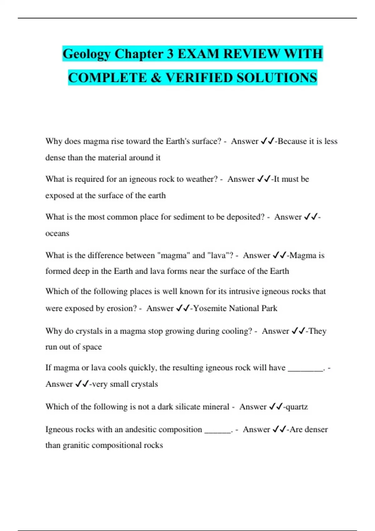 Why does magma rise toward the Earth's surface? - Answer ️️-Because it is less dense than the material around it What is required for an igneous rock to weather? - Answer ️️-It must be exposed at the surface of the earth What is the most common place for sediment to be deposited? - Answer ️️-oceans