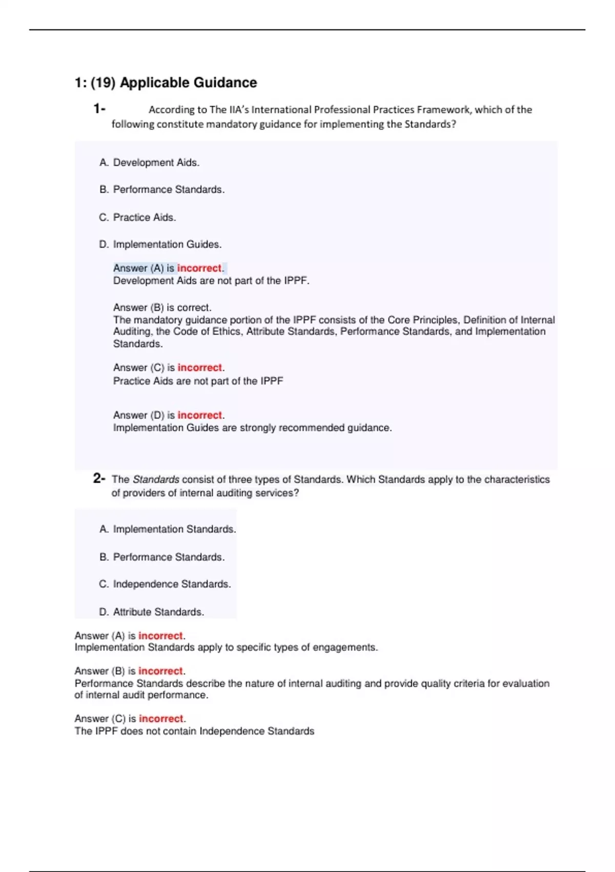 1: (19) Applicable Guidance 1- According to The IIA’s International Professional Practices Framework, which of the following constitute mandatory guidance for implementing the Standards? A. Development Aids. B. Performance Standards. C. Practice Aids. D. Implementation Guides. Answer (A) is incorrect. Development Aids are not part of the IPPF. Answer (B) is correct. The mandatory guidance portion of the IPPF consists of the Core Principles, Definition of Internal Auditing, the Code of Ethics, Attribute Standards, Performance Standards, and Implementation Standards. Answer (C) is incorrect. Practice Aids are not part of the IPPF Answer (D) is incorrect. Implementation Guides are strongly recommended guidance. 2- The Standards consist of three types of Standards. Which Standards apply to the characteristics of providers of internal auditing services? A. Implementation Standards. B. Performance Standards. C. Independence Standards. D. Attribute Standards. Answer (A) is incorrect. Implementation Standards apply to specific types of engagements. Answer (B) is incorrect. Performance Standards describe the nature of internal auditing and provide quality criteria for evaluation of internal audit performance. Answer (C) is incorrect. The IPPF does not contain Independence Standards Answer (D) is correct. Attribute Standards describe the characteristics of organizations and parties providing internal auditing services. 3- The types of services provided by the internal audit activity can best be described as A. Auditing and consulting. B. Auditing and engagement. C. Assurance and consulting. D. Auditing and assurance. Answer (A) is incorrect. The IIA Glossary defines assurance and consulting, not auditing and consulting, as the types of services provided by the internal audit activity. Answer (B) is incorrect. Engagement is not a type of internal audit service. Answer (C) is correct The internal audit activity provides independent, objective assurance and consulting services designed to add value and improve an organization’s operations (Definition of Internal Auditing). Answer (D) is incorrect. The IIA Glossary defines assurance and consulting, not auditing and assurance, as the types of services provided by the internal audit activity. 4- An internal auditor often faces special problems when performing an engagement at a foreign subsidiary. Which of the following statements is false with respect to the conduct of international engagements? A. The IIA Standards do not apply outside of the United States. B. The internal auditor should determine whether managers are in compliance with local laws. C. It is preferable to have multilingual internal auditors conduct engagements at branches in foreign nations. D. There may be justification for having different organizational policies in force in foreign branches. Answer (A) is correct Pronouncements by The IIA have no geographic limits. Compliance with the concepts in the Standards is essential for the responsibilities of internal auditors to be met, regardless of the national environment