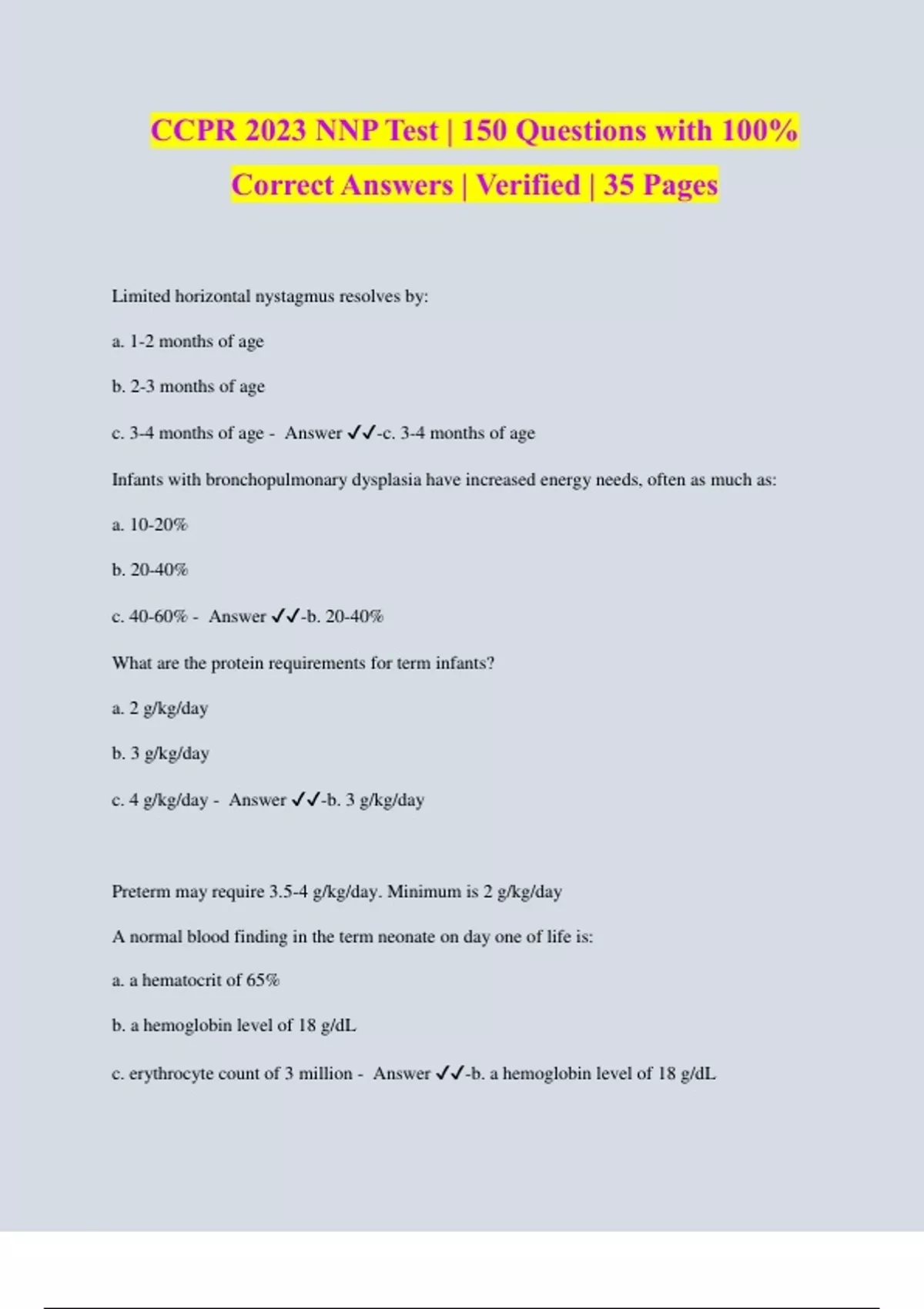 Limited horizontal nystagmus resolves by: a. 1-2 months of age b. 2-3 months of age c. 3-4 months of age - Answer ️️-c. 3-4 months of age Infants with bronchopulmonary dysplasia have increased energy needs, often as much as: a. 10-20% b. 20-40% c. 40-60% - Answer ️️-b. 20-40%