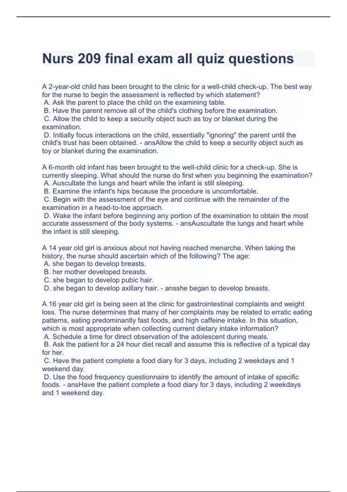 Nurs 209 final exam all quiz questions