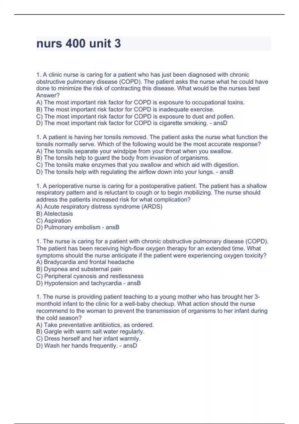 1. A clinic nurse is caring for a patient who has just been diagnosed with chronic obstructive pulmonary disease (COPD). The patient asks the nurse what he could have done to minimize the risk of contracting this disease. What would be the nurses best Answer? A) The most important risk factor for COPD is exposure to occupational toxins. B) The most important risk factor for COPD is inadequate exercise. C) The most important risk factor for COPD is exposure to dust and pollen. D) The most important risk factor for COPD is cigarette smoking. - ansD