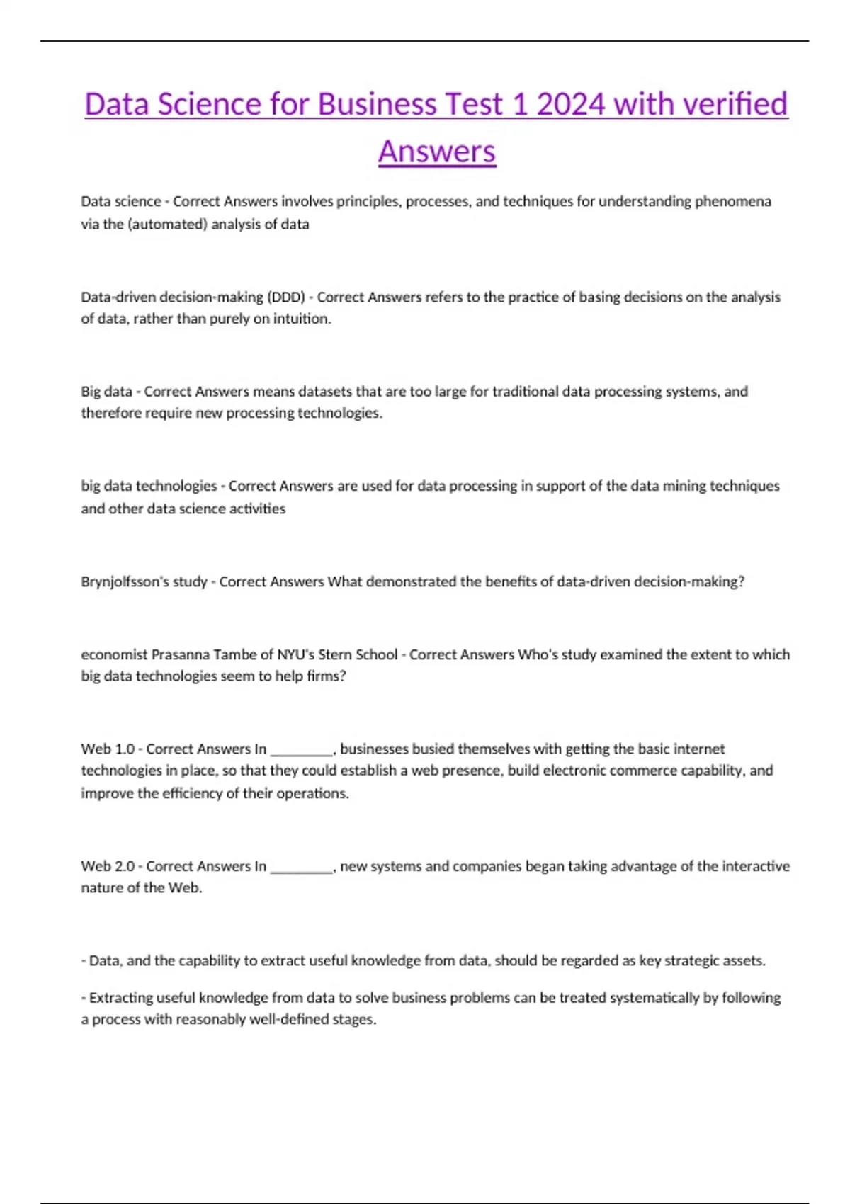 Data Science for Business Test 1 2024 with verified Answers