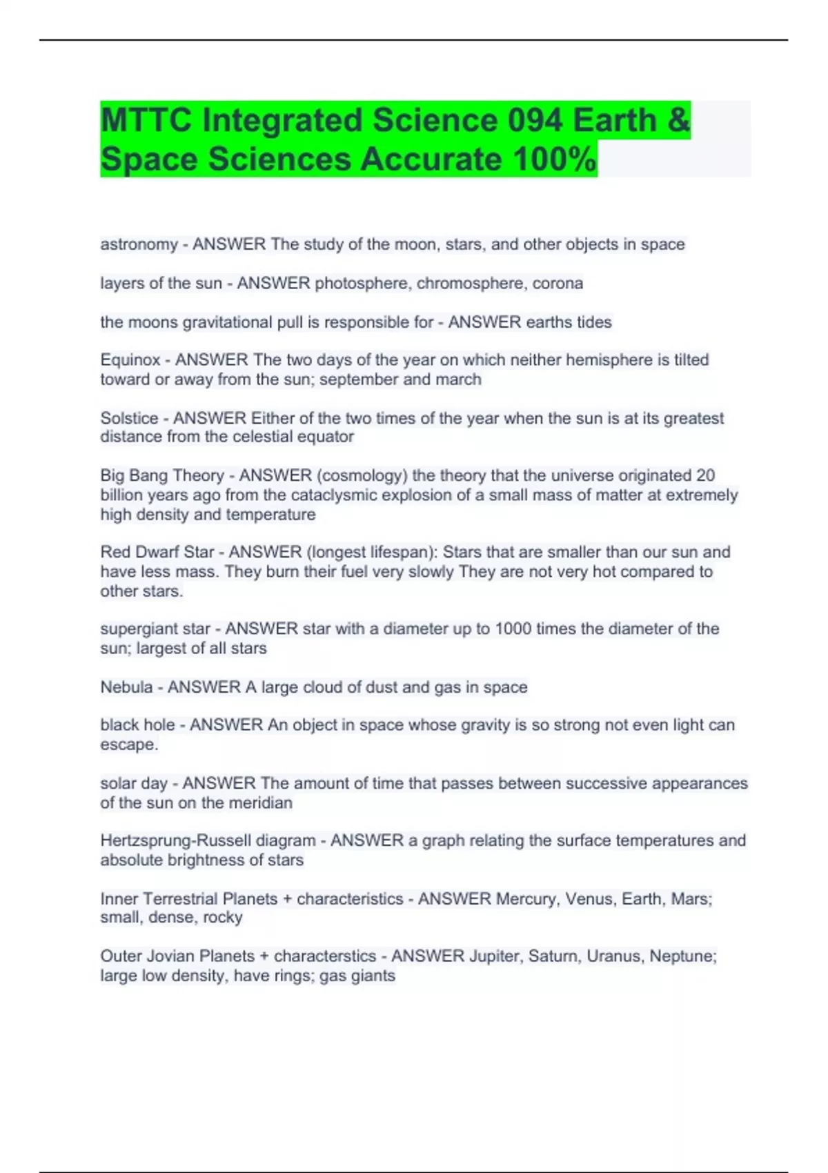 astronomy - ANSWER The study of the moon, stars, and other objects in space layers of the sun - ANSWER photosphere, chromosphere, corona the moons gravitational pull is responsible for - ANSWER earths tides Equinox - ANSWER The two days of the year on which neither hemisphere is tilted toward or away from the sun; september and march Solstice - ANSWER Either of the two times of the year when the sun is at its greatest distance from the celestial equator Big Bang Theory - ANSWER (cosmology) the theory that the universe originated 20 billion years ago from the cataclysmic explosion of a small mass of matter at extremely high density and temperature Red Dwarf Star - ANSWER (longest lifespan): Stars that are smaller than our sun and have less mass. They burn their fuel very slowly They are not very hot compared to other stars. supergiant star - ANSWER star with a diameter up to 1000 times the diameter of the sun; largest of all stars Nebula - ANSWER A large cloud of dust and gas in space black hole - ANSWER An object in space whose gravity is so strong not even light can escape. solar day - ANSWER The amount of time that passes between successive appearances of the sun on the meridian Hertzsprung-Russell diagram - ANSWER a graph relating the surface temperatures and absolute brightness of stars Inner Terrestrial Planets + characteristics - ANSWER Mercury, Venus, Earth, Mars; small, dense, rocky Outer Jovian Planets + characterstics - ANSWER Jupiter, Saturn, Uranus, Neptune; large low density, have rings; gas giants between the inner and outer planets is - ANSWER asteroid belt the distance between the earth and the sun is known as - ANSWER 1 astronomical unit (AU) the suns energy is produced by - ANSWER nuclear fusion reactions order of the planets - ANSWER MVEMJSUN - Mercury Venus Earth Mars Jupiter Saturn Uranus Neptune Kuiper Belt - ANSWER A region of the solar system that is just beyond the orbit of Neptune and that contains small bodies made mostly of ice waxing moon - ANSWER the phase of the Moon when an increasing amount of the Moon's near side is sunlit Waning - ANSWER (of the moon) pertaining to the period during which the visible surface of the moon decreases eclipse of the sun - ANSWER Occurs during a new Moon when the side of the Moon facing the Earth is not illuminated -The Moon passes in front of the Sun and blocks its view from Earth eclipse of the moon (lunar eclipse) - ANSWER the moon passes through the shadow of the earth and blocks sunlight from reaching it