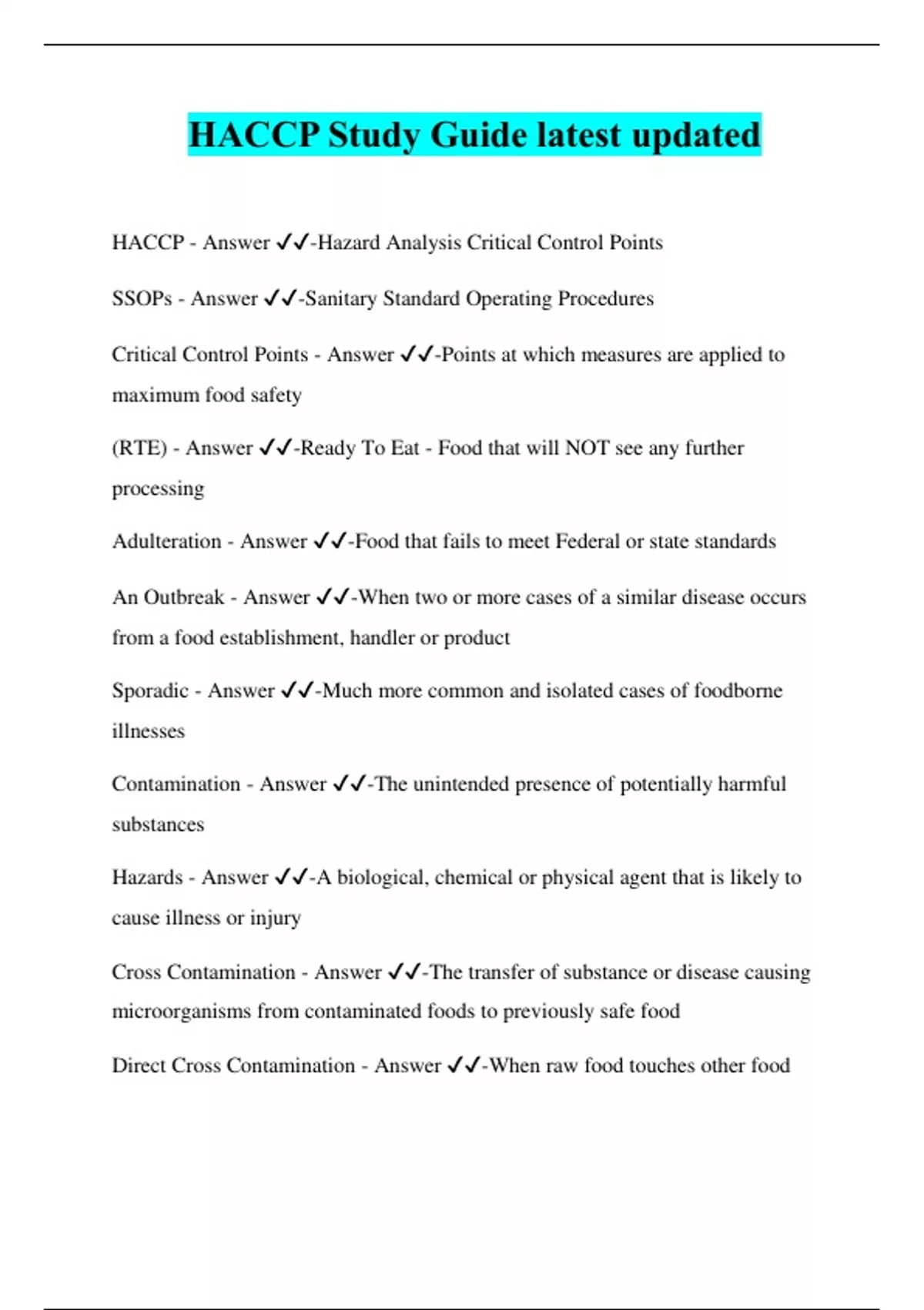 HACCP - Answer ️️-Hazard Analysis Critical Control Points SSOPs - Answer ️️-Sanitary Standard Operating Procedures Critical Control Points - Answer ️️-Points at which measures are applied to maximum food safety