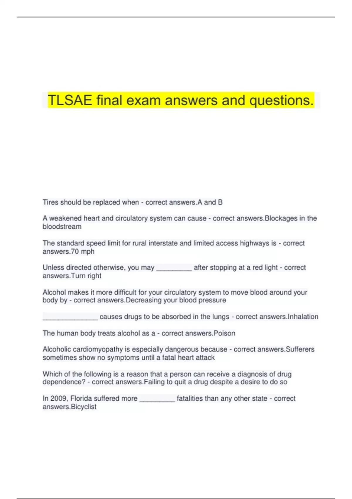TLSAE final exam answers and questions. Tires should be replaced when - correct answers.A and B A weakened heart and circulatory system can cause - correct answers.Blockages in the bloodstream The standard speed limit for rural interstate and limited access highways is - correct answers.70 mph Unless directed otherwise, you may _________ after stopping at a red light - correct answers.Turn right Alcohol makes it more difficult for your circulatory system to move blood around your body by - correct answers.Decreasing your blood pressure ______________ causes drugs to be absorbed in the lungs - correct answers.Inhalation The human body treats alcohol as a - correct answers.Poison Alcoholic cardiomyopathy is especially dangerous because - correct answers.Sufferers sometimes show no symptoms until a fatal heart attack Which of the following is a reason that a person can receive a diagnosis of drug dependence? - correct answers.Failing to quit a drug despite a desire to do so In 2009, Florida suffered more _________ fatalities than any other state - correct answers.Bicyclist Crashes caused by speeding vehicles killed __________ people in 2009. - correct answers.10,591 _________ commonly cause increased energy and alertness, increased heart rate and respiration, and loss of appetite - correct answers.Stuimulants In 2007, __________ Floridians died in alcohol-related collisions - correct answers.1,051 Your license can never be revoked for a temporary medical condition (True or False) - correct answers.False Which of the following drugs has an increased risk of overdose when taken with alcohol? - correct answers.All choices are correct The ___________ coordinates numerous bodily functions by sending signals from one cell to another or from one region to another - correct answers.Nervous system Most ________ signs are diamond-shaped with a yellow background and black letters or symbols - correct answers.Warning Inhalants include chemicals found in - correct answers.Paint thinners, lighter fluid, glue, and whipped cream spray bottles Of the 3,558 people impaired drivers killed in 2009 (not counting the driver's themselves) _________ deaths were preventable - correct answers.3,558 The total cost of underage drinking in the state of Florida in 2007 was __________ per Florida resident. - correct answers.$165 Alcohol __________ by making it difficult to anticipate driving situations. - correct answers.Increases your reaction time Which of the following people is required by law to wear a seat belt? - correct answers.The driver of truck made in 1973 _______ have effects similar to those of LSD, but with stronger effects of dulled sense, loss of sense of self, and sedation - correct answers.Disassociatives To avoid ___________, a person who is dependent on a drug might use the drug in the morning, at work, in the car, or while supervising children - correct answers.Withdrawl __________ absorption can cause permanent loss of sense of smell - correct answers.Intranasal