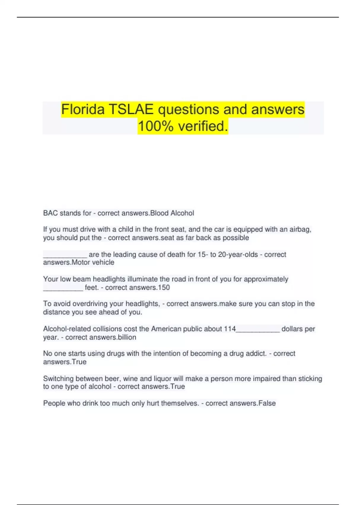 Florida TSLAE questions and answers 100% verified. BAC stands for - correct answers.Blood Alcohol If you must drive with a child in the front seat, and the car is equipped with an airbag, you should put the - correct as far back as possible ___________ are the leading cause of death for 15- to 20-year-olds - correct answers.Motor vehicle Your low beam headlights illuminate the road in front of you for approximately __________ feet. - correct answers.150 To avoid overdriving your headlights, - correct sure you can stop in the distance you see ahead of you. Alcohol-related collisions cost the American public about 114___________ dollars per year. - correct on No one starts using drugs with the intention of becoming a drug addict. - correct answers.True Switching between beer, wine and liquor will make a person more impaired than sticking to one type of alcohol - correct answers.True People who drink too much only hurt themselves. - correct answers.False