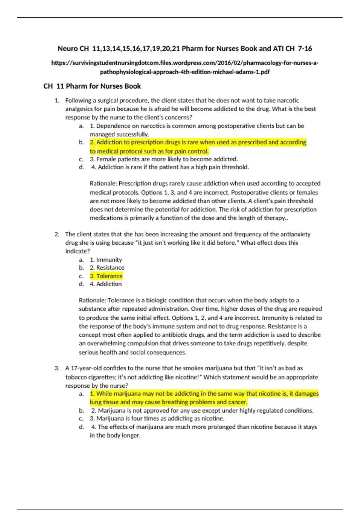 Neuro CH11,13,14,15,16,17,19,20,21 Pharm for Nurses Book and ATI CH7-16 1.Following a surgical procedure, the client states that he does not want to take narcotic analgesicsfor pain because he is afraid he will become addicted to the drug. What is the best response bythe nurse to the client's concerns?a.1. Dependence on narcotics is common among postoperative clients but can bemanaged successfully.b.2. Addiction to prescription drugs is rare when used as prescribed and according tomedical protocol such as for pain control.c.3. Female patients are more likely to become addicted.d.4. Addiction is rare if the patient has a high pain threshold.Rationale: Prescription drugs rarely cause addiction when used according to acceptedmedical protocols. Options 1, 3, and 4 are incorrect. Postoperative clients or femalesare not more likely to become addicted than other clients. A client's pain thresholddoes not determine the potential for addiction. The risk of addiction for prescriptionmedications is primarily a function of the dose and the length of therapy.. 2.The client states that she has been increasing the amount and frequency of the antianxiety drugshe is using because "it just isn't working like it did before." What effect does this indicate?a.1. Immunityb.2. Resistancec.3. Toleranced.4. AddictionRationale: Tolerance is a biologic condition that occurs when the body adapts to asubstance after repeated administration. Over time, higher doses of the drug are requiredto produce the same initial effect. Options 1, 2, and 4 are incorrect. Immunity is related tothe response of the body's immune system and not to drug response. Resistance is aconcept most often applied to antibiotic drugs, and the term addiction is used to describean overwhelming compulsion that drives someone to take drugs repetitively, despiteserious health and social consequences. 3.A 17-year-old confides to the nurse that he smokes marijuana but that "it isn't as bad as tobaccocigarettes; it's not addicting like nicotine!" Which statement would be an appropriate responseby the nurse?a.1. While marijuana may not be addicting in the same way that nicotine is, it damageslung tissue and may cause breathing problems and cancer.b.2. Marijuana is not approved for any use except under highly regulated conditions.c.3. Marijuana is four times as addicting as nicotine.d.4. The effects of marijuana are much more prolonged than nicotine because it stays inthe body longer. Rationale: Marijuana does not appear to cause physical dependence or tolerance butbecause it is inhaled deeper and held in the lungs for a longer length of time, it maydamage lung tissue and promote cancer. Options 2, 3, and 4 are incorrect. Marijuana is acontrolled substance; however, because this teen is using the drug, stating this fact mayhave little influence on his use. Marijuana has not been shown to be more addicting thannicotine. And while metabolites of m