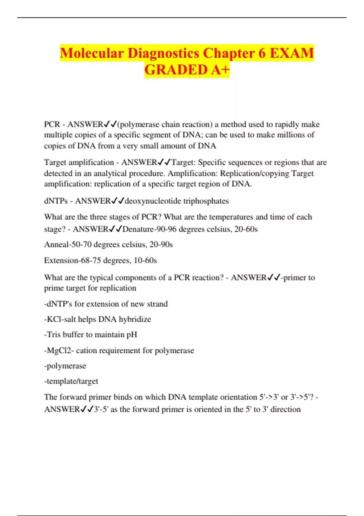 Molecular Diagnostics Chapter 6 EXAM GRADED A+ PCR - ANSWER(polymerase chain reaction) a method used to rapidly make multiple copies of a specific segment of DNA; can be used to make millions of copies of DNA from a very small amount of DNA Target amplification - ANSWERTarget: Specific sequences or regions that are detected in an analytical procedure. Amplification: Replication/copying Target amplification: replication of a specific target region of DNA. dNTPs - ANSWERdeoxynucleotide triphosphates What are the three stages of PCR? What are the temperatures and time of each stage? - ANSWERDenature-90-96 degrees celsius, 20-60s Anneal-50-70 degrees celsius, 20-90s Extension-68-75 degrees, 10-60s What are the typical components of a PCR reaction? - ANSWER-primer to prime target for replication -dNTP's for extension of new strand -KCl-salt helps DNA hybridize -Tris buffer to maintain pH -MgCl2- cation requirement for polymerase -polymerase -template/target The forward primer binds on which DNA template orientation 5'->3' or 3'->5'? - ANSWER3'-5' as the forward primer is oriented in the 5' to 3' direction The reverse primer binds on which DNA template orientation 5'->3' or 3'->5'? - ANSWER5' to 3' Which step of PCR determines the specificity of the reaction? - ANSWERprimer annealing to template strand because determines what will be duplicated primer design - ANSWER• Primers should be 20 - 30 base pairs long (too short = not very specific, too long = difficult to bind to D