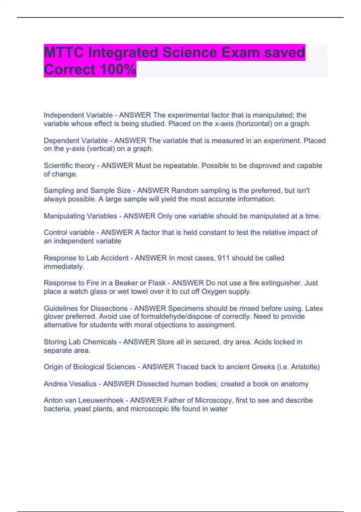 Independent Variable - ANSWER The experimental factor that is manipulated; the variable whose effect is being studied. Placed on the x-axis (horizontal) on a graph. Dependent Variable - ANSWER The variable that is measured in an experiment. Placed on the y-axis (vertical) on a graph. Scientific theory - ANSWER Must be repeatable. Possible to be disproved and capable of change. Sampling and Sample Size - ANSWER Random sampling is the preferred, but isn't always possible. A large sample will yield the most accurate information. Manipulating Variables - ANSWER Only one variable should be manipulated at a time. Control variable - ANSWER A factor that is held constant to test the relative impact of an independent variable Response to Lab Accident - ANSWER In most cases, 911 should be called immediately. Response to Fire in a Beaker or Flask - ANSWER Do not use a fire extinguisher. Just place a watch glass or wet towel over it to cut off Oxygen supply. Guidelines for Dissections - ANSWER Specimens should be rinsed before using. Latex glover preferred. Avoid use of formaldehyde/dispose of correctly. Need to provide alternative for students with moral objections to assingment. Storing Lab Chemicals - ANSWER Store all in secured, dry area. Acids locked in separate area. Origin of Biological Sciences - ANSWER Traced back to ancient Greeks (i.e. Aristotle) Andrea Vesalius - ANSWER Dissected human bodies; created a book on anatomy Anton van Leeuwenhoek - ANSWER Father of Microscopy, first to see and describe bacteria, yeast plants, and microscopic life found in water Scanning Electron Microscope (SEM) - ANSWER Instead of a light, a beam of electrons pass through specimen. Resolution about 1,000 times greater than light microscope. Will kill specimen though. Robert Hooke - ANSWER Famous for Hook's law describing elasticity. But called a "virtuoso", able to contribute findings to any major field in science Carl Von Linnaeus - ANSWER Famous for binomial system of nomenclature. Each living organism has two names, a genus and species. Considered father of modern ecology and taxonomy Pasteur - ANSWER Discovered role of microorganisms in the cause of disease, pasteurization, and rabies vaccine. Koch's Postulates - ANSWER Specific diseases caused by specific pathogens Cell theory - ANSWER Cell is the common structural unit in plants and animals. Proposed by Mattias Scheleiden and Schwann. Watson and Crick - ANSWER Discovered the structure of DNA was a double helix (in the 1950s). Made it possible to understand how DNA replicated and synthesized proteins Commonalities Among all Sciences - ANSWER - Systems, order, and organization - Evidence, models, and explanation - Constancy, change, and measurement - Evolution and equilibrium - Form and function Empirical Evidence - ANSWER All evidence is empirical; all evidence must be observed by the five sense. Peer-reviewed Journals - ANSWER Most accepted source for information on scientific experiments and studies Air Pollution - ANSWER Chemicals in the air; include carbon monoxide, sulfur dioxide, and chlorofluorocarbons (CFC's) Water Pollution - ANSWER Contaminants enter water by ground runoff or by leaching Thermal pollution - ANSWER Factories dump water at high temperatures which increases normal water temperatures. This means the water can hold less gas, disrupting the ecosystem Greenhouse gasses - ANSWER I.e. carbon dioxide and nitrous oxide. Concentration of them is increased by burning fossil fuels. These gasses absorb and trap heat, therefore warming the planet Acid ran - ANSWER Sulfur and nitrous oxides converted to acids and contaminate water supplies Prokaryotes - ANSWER Single-celled organisms that do not have a membrane-bound nucleus Flagella - ANSWER Appendages on bacteria cells; used for movement Pili - ANSWER Used by bacteria cells to attach to other cells Cell Wall - ANSWER a thin membrane around the cytoplasm of a cell Cell membrane - ANSWER a phospholipid layer that covers a cell's surface and acts as a barrier between the inside of a cell and the cell's environment Eukaryotes - ANSWER organisms whose cells contain a nucleus and other membrane bound organelles Nucleus - ANSWER a part of the cell containing DNA and RNA and responsible for growth and reproduction Nucleolus - ANSWER The organelle where ribosomes are made, synthesized and partially assembled, located in the nucleus Ribosomes - ANSWER site of protein synthesis Endoplasmic Reticulum - ANSWER an internal membrane system in which components of cell membrane and some proteins are constructed Golgi apparatus - ANSWER stack of membranes in the cell that modifies, sorts, and packages proteins from the endoplasmic reticulum Lysosomes - ANSWER An organelle containing digestive enzymes; found mostly in animal cells Mitochondria - ANSWER Powerhouse of the cell, organelle that is the site of ATP (energy) production Plastids - ANSWER Include chloroplasts, chromoplasts, and amyloplasts (leucoplasts); only found in photosynthetic organisms Vacuoles - ANSWER saclike structures that store materials such as water, salts, proteins, and carbohydrates Cytoskeleton - ANSWER network of protein filaments within some cells that helps the