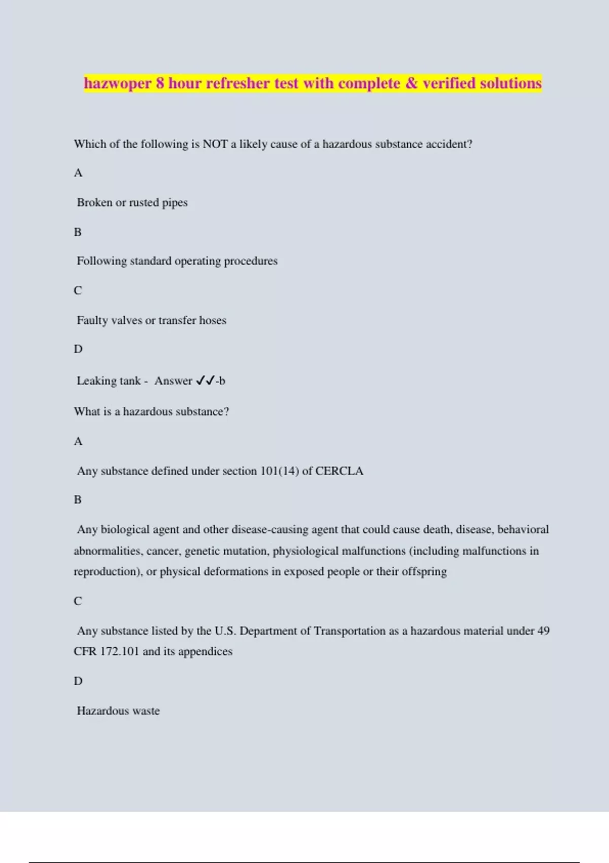 Which of the following is NOT a likely cause of a hazardous substance accident? A. Broken or rusted pipes B. Following standard operating procedures C. Faulty valves or transfer hoses D. Leaking tank - Answer ️️-b
