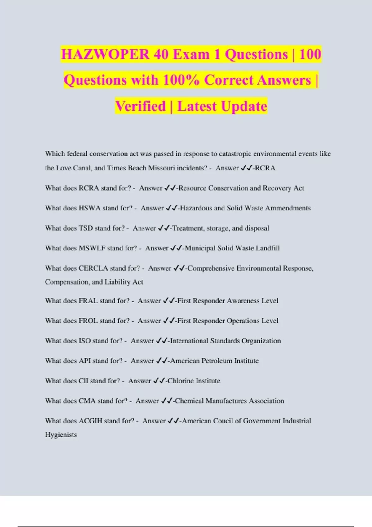 HAZWOPER 40 Exam 1 Questions | 100 Questions with 100% Correct Answers | Verified | Latest Update