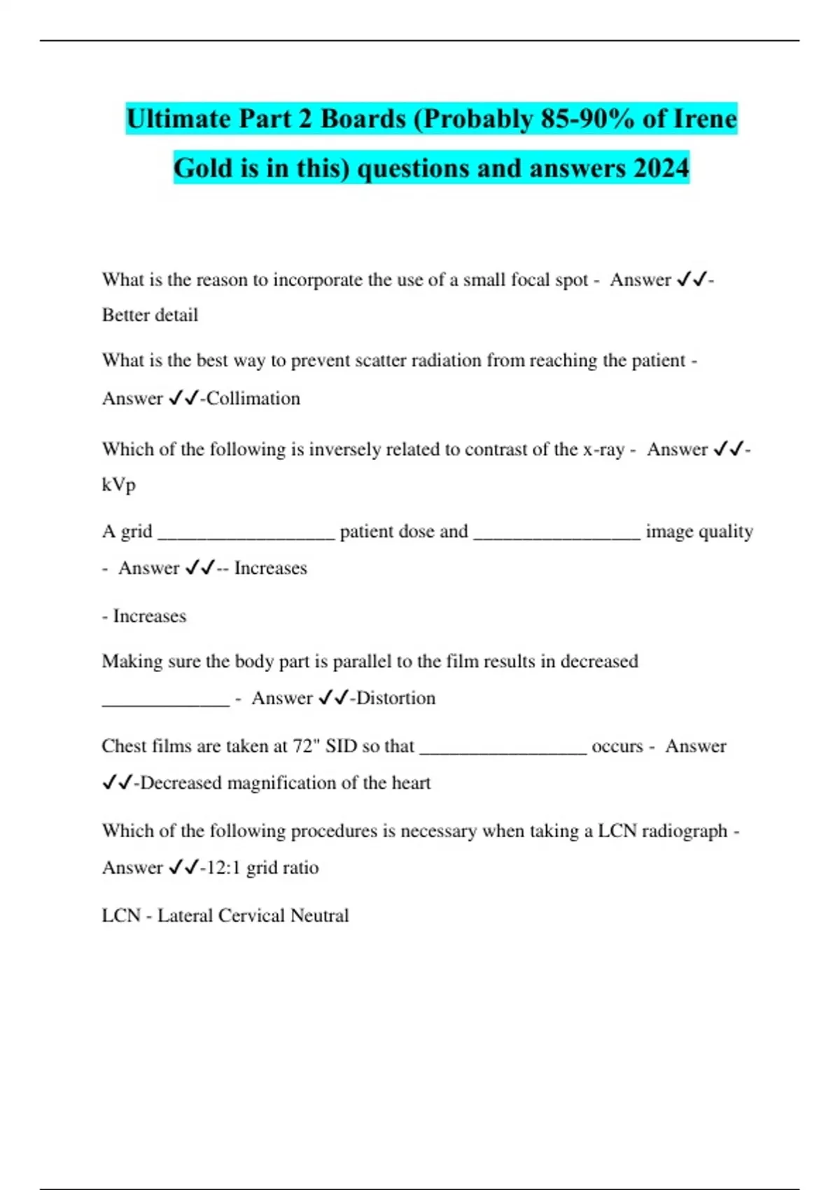 What is the reason to incorporate the use of a small focal spot - Answer ️️-Better detail What is the best way to prevent scatter radiation from reaching the patient - Answer ️️-Collimation Which of the following is inversely related to contrast of the x-ray - Answer ️️-kVp