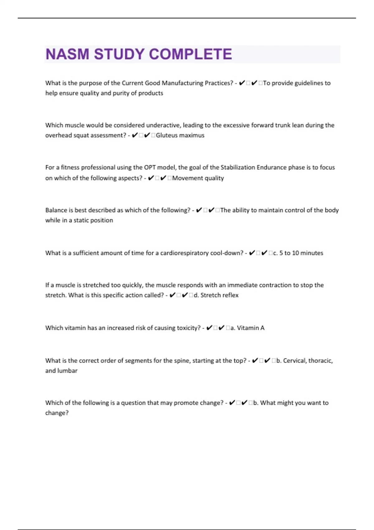 What is the purpose of the Current Good Manufacturing Practices? - ️️To provide guidelines to help ensure quality and purity of products Which muscle would be considered underactive, leading to the excessive forward trunk lean during the overhead squat assessment? - ️️Gluteus maximus For a fitness professional using the OPT model, the goal of the Stabilization Endurance phase is to focus on which of the following aspects? - ️️Movement quality Balance is best described as which of the following? - ️️The ability to maintain control of the body while in a static position What is a sufficient amount of time for a cardiorespiratory cool-down? - ️️c. 5 to 10 minutes If a muscle is stretched too quickly, the muscle responds with an immediate contraction to stop the stretch. What is this specific action called? - ️️d. Stretch reflex Which vitamin has an increased risk of causing toxicity? - ️️a. Vitamin A What is the correct order of segments for the spine, starting at the top? - ️️b. Cervical, thoracic, and lumbar Which of the following is a question that may promote change? - ️️b. What might you want to change?