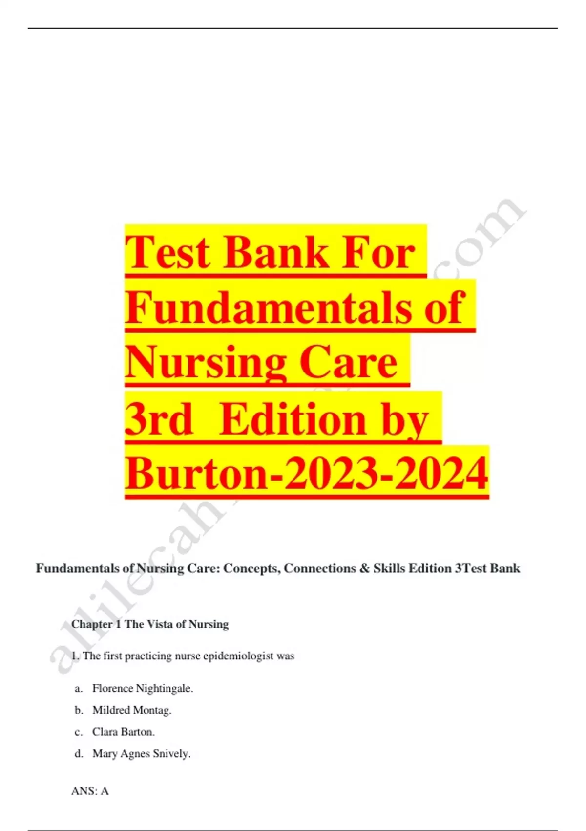 Test bank for fundamentals of nursing care 3rd edition by burton Latest Update