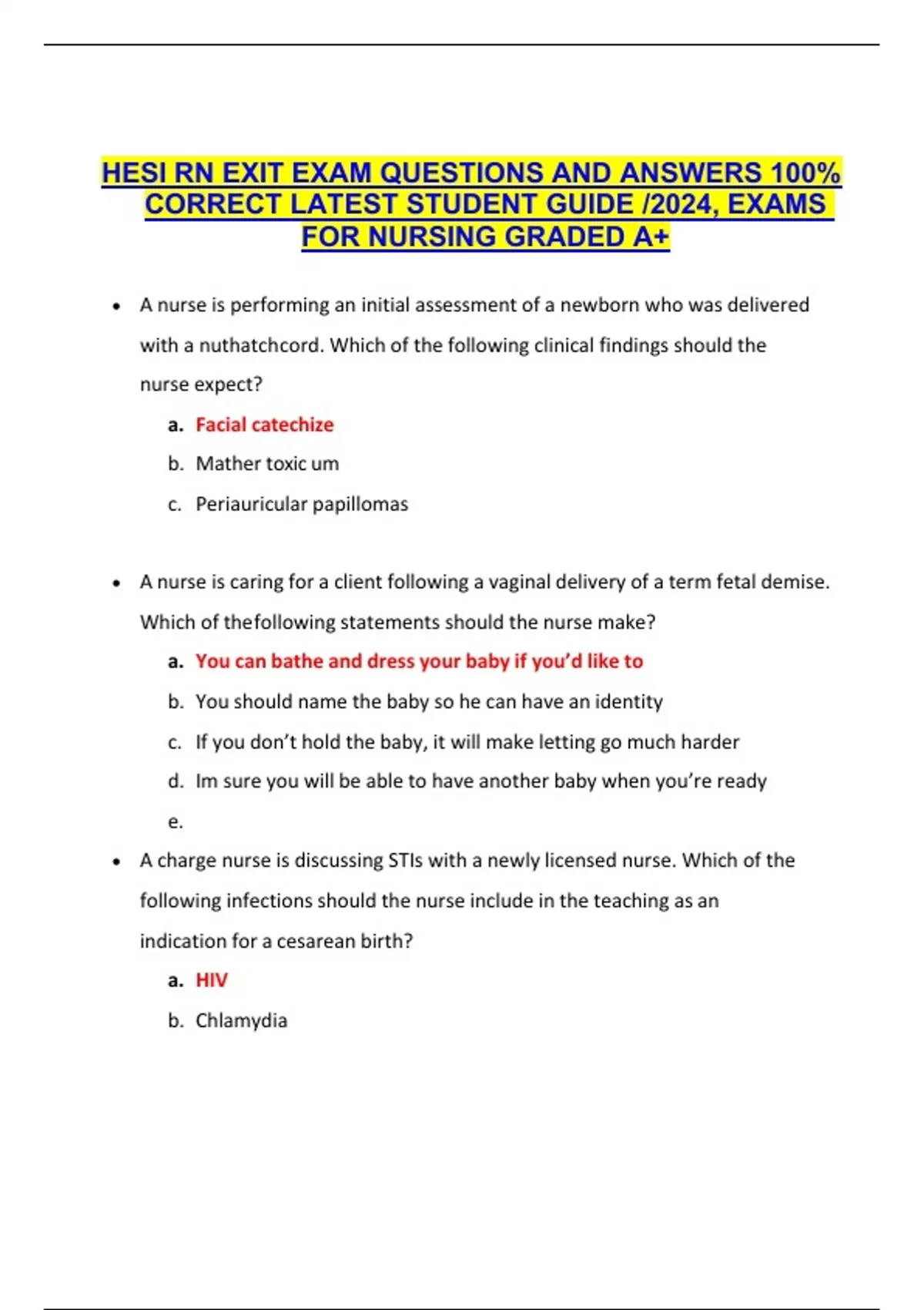 HESI RN EXIT EXAM QUESTIONS AND ANSWERS 100% CORRECT LATEST STUDENT GUIDE /2024, EXAMS FOR NURSING GRADED A+ A nurse is performing an initial assessment of a newborn who was delivered with a nuthatch cord. Which of the following clinical findings should the nurse expect? a.Facial catechize b.Mather toxic um c.Periauricular papillomas A nurse is caring for a client following a vaginal delivery of a term fetal demise. Which of the following statements should the nurse make? a.You can bathe and dress your baby if you’d like to b.You should name the baby so he can have an identity c.If you don’t hold the baby, it will make letting go much harder d.Im sure you will be able to have another baby when you’re ready e. A charge nurse is discussing STIs with a newly licensed nurse. Which of the following infections should the nurse include in the teaching as an indication for a cesarean birth? a.HIV b.Chlamydia c.Gonorrhea d.Syphilis A nurse is reviewing the medication prescriptions for a newborn who is 6 hours old and whose mother is HBsAg-positive. The nurse should anticipate administering which of the following medications? a.Hepatitis B Immune Globulin b.Hepatitis A immune globulin c.Haemophilus inflenzae type B vaccine d.Hepatitis A vaccine A nurse is assessing a client immediately following the placement of an epidural. The nurse obtains a maternal blood pressure of 96/54 and a fetal HR of 102/min. Which of the following actions should the nurse take? a.Position the client in a lateral position b.OR administer naloxone to the client??? c.Prepare the client for an amnioinfusion d.Place the client in knee-chest position A nurse is planning care for a full-term newborn who is receiving phototherapy. Which of the following actions should the nurse include in the plan of care? a.Avoid using lotion or ointment on the newborn’s skin Dress the newborn