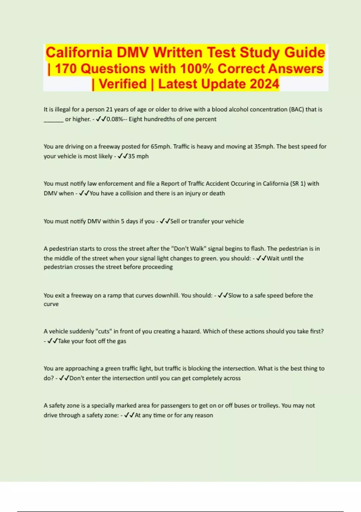 California DMV Written Test Study Guide | 170 Questions with 100% Correct Answers | Verified | Latest Update 2024