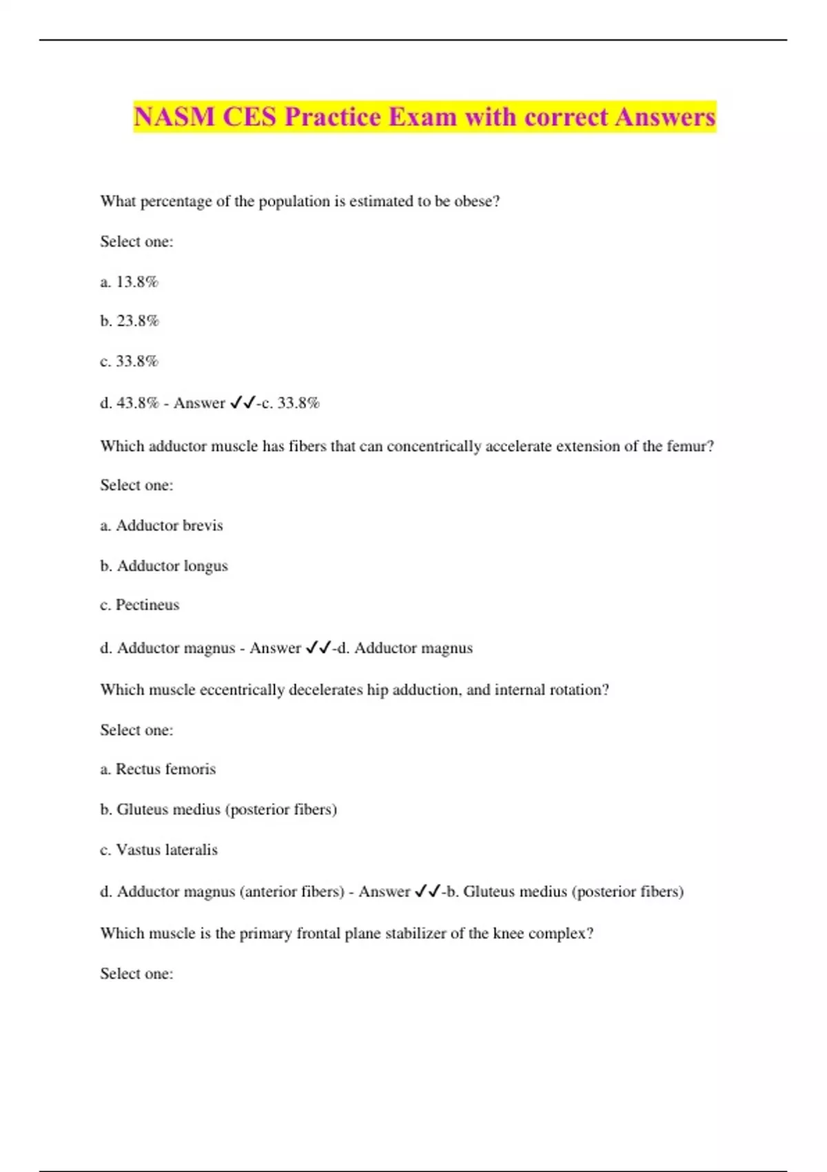 What percentage of the population is estimated to be obese? Select one: a. 13.8% b. 23.8% c. 33.8% d. 43.8% - Answer ️️-c. 33.8% Which adductor muscle has fibers that can concentrically accelerate extension of the femur? Select one: a. Adductor brevis b. Adductor longus c. Pectineus d. Adductor magnus - Answer ️️-d. Adductor magnus