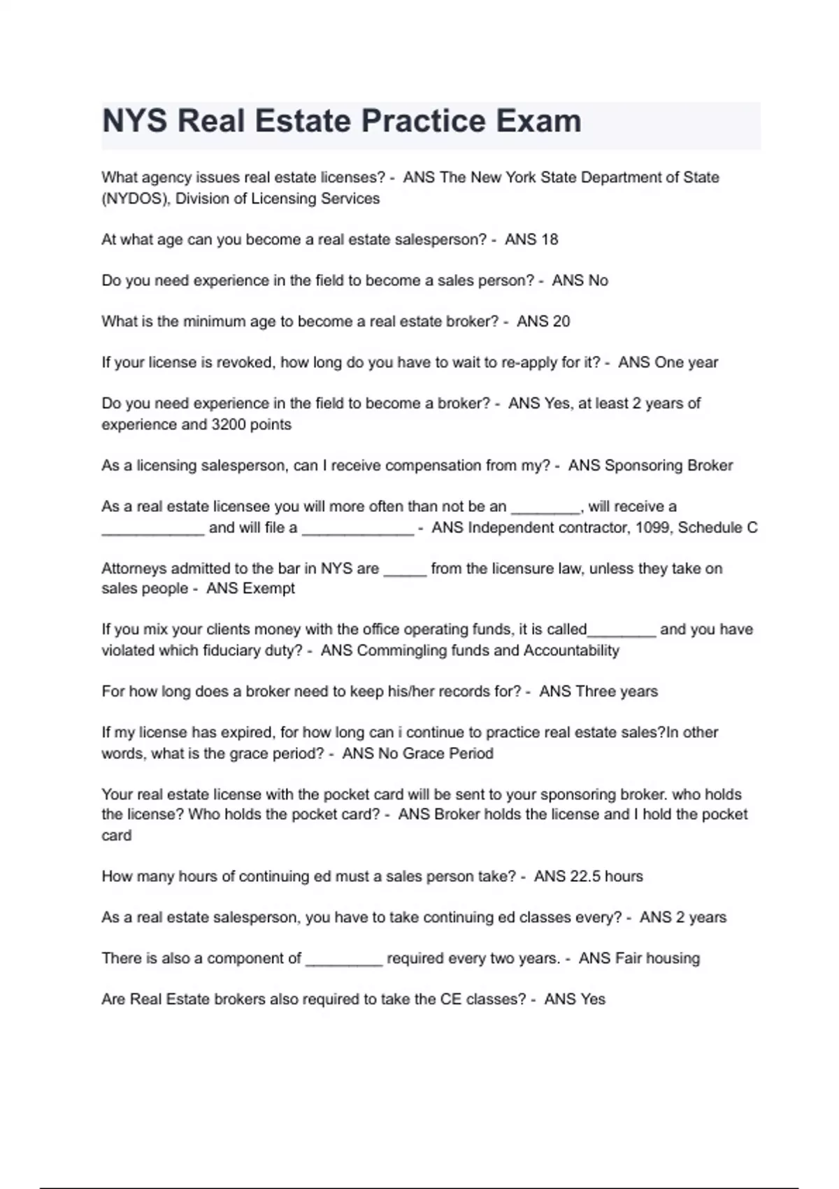 NYS Real Estate Salesperson license Practice Exam Questions with correct Answers 2024( A+ GRADED 100% VERIFIED).