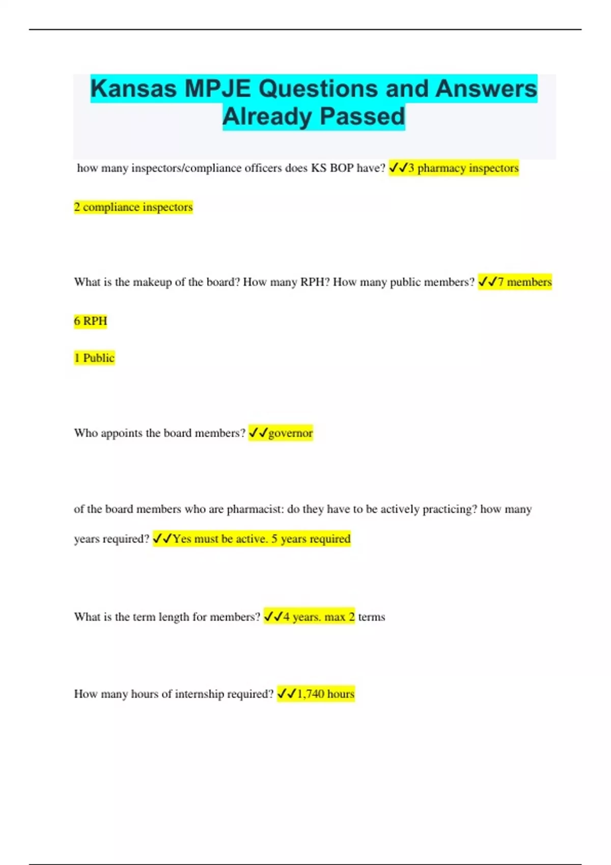 Kansas MPJE Questions and Answers Already Passed how many inspectors/compliance officers does KS BOP have? 3 pharmacy inspectors 2 compliance inspectors What is the makeup of the board? How many RPH? How many public members? 7 members 6 RPH 1 Public Who appoints the board members? governor of the board members who are pharmacist: do they have to be actively practicing? how many years required? Yes must be active. 5 years required What is the term length for members? 4 years. max 2 terms How many hours of internship required? 1,740 hours How to be preceptor? Licensed RPH w/ at least 2 years experience and who supervises students obtaining pharmaceutical experience as required by law as a condition to taking exam for licensure as a RPH How long does intern registration last for? 6 yrs Min age to be RPH? 18 Special requirements to be PIC? Must score at least 85% on board administered exam how many CE requirement hours do pharmacists need every 2 years? 30 "clock hours" how many CE requirement hours do pharmacy techs need every 2 years? 20 "clock hours" Are techs required to pass an exam? As of July 1, 2017 techs shall be required to pass a certified pharmacy tech exam approved by the board Tech: RPh ratio? 2:1 in all settings may increase to 3:1 if 2 of the techs have current certification Can a pharmacy technician take a verbal order/called in RX from a dr office? NO Can a pharmacy technician call the dr. office for a refill authorization? Yes (no new scripts, refills are ok) Rule regarding permit to sell non-prescription drugs? if the retail establishments sells more than 12 diff OTC's then required to get permit. Pharmacies are exempt. Non-resident pharmacy registration requirements? required to renew registration annually What agency issues a license to a wholesale distributor? How often does it have to be renewed? Board of pharmacy 1 yr Schedule V OTC Drugs Ok? yes How long do prescription records have to be kept? 5 yrs How long is a C-II RX good for? 6 months from date written CII- CV time limits? 5 refills, 6 months from date written
